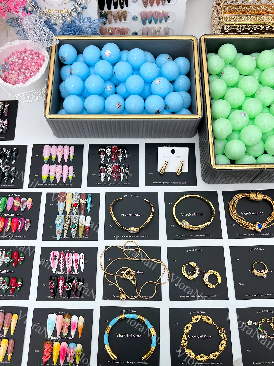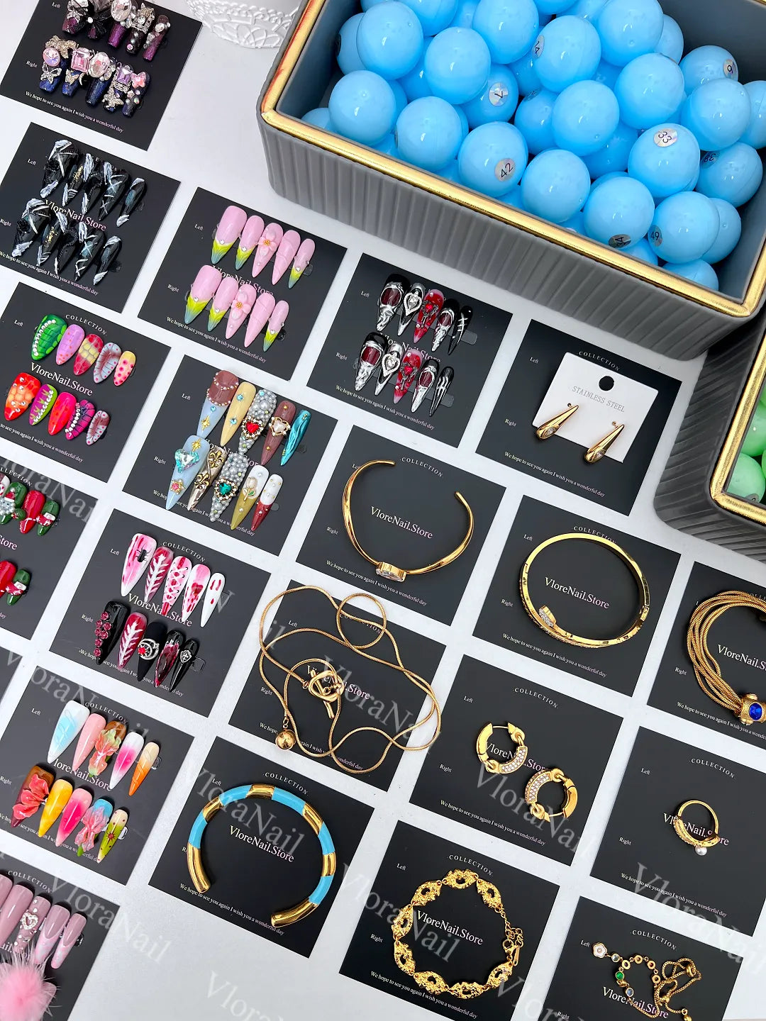 We have over 800 pieces of jewelry (please check our sister store magnificentqueens.store for details, including available and unreleased items) and a variety of freshly handmade nails. Every order is randomly selected. To see examples of what you might receive, check out our TikTok unboxing videos.