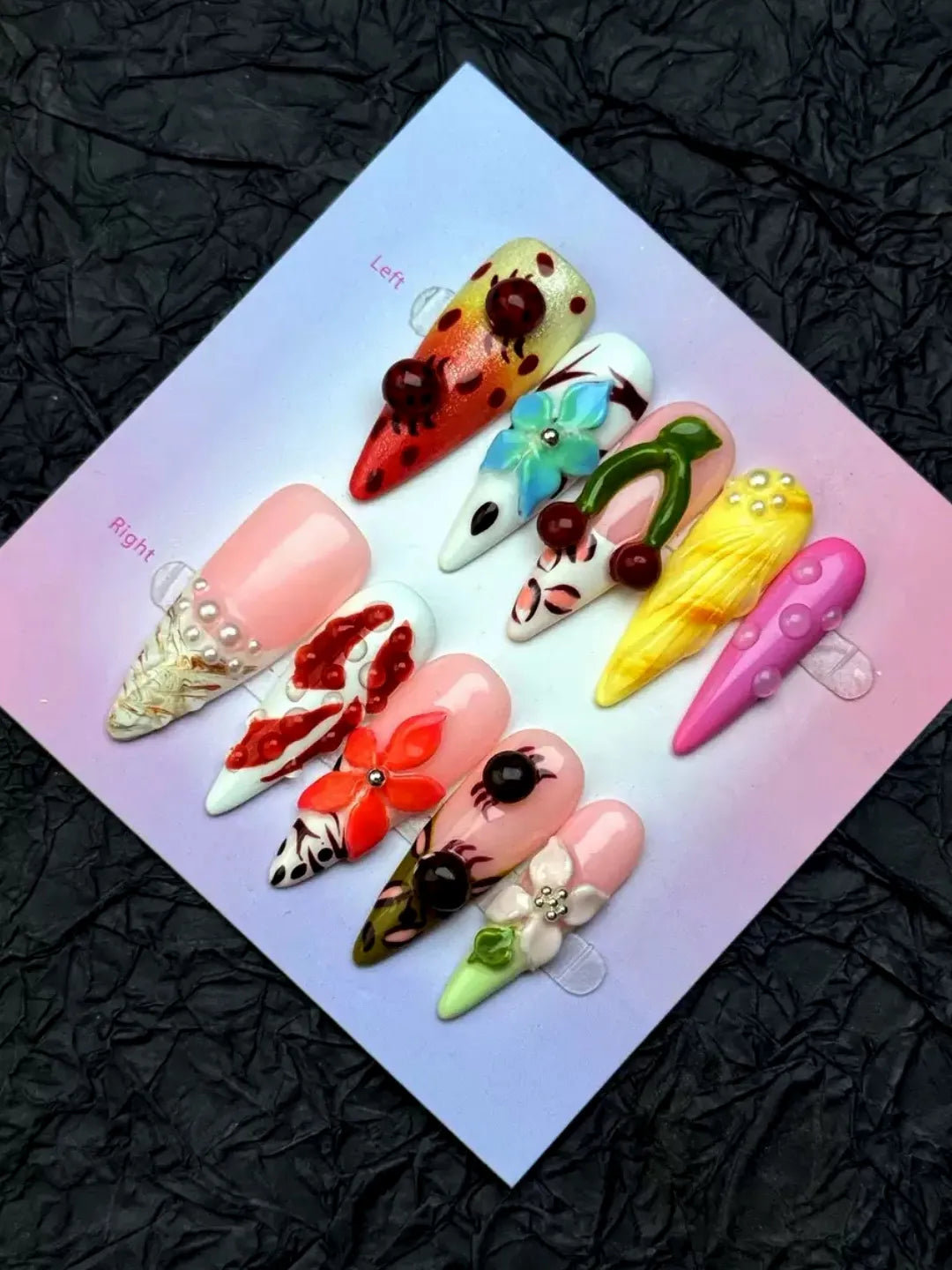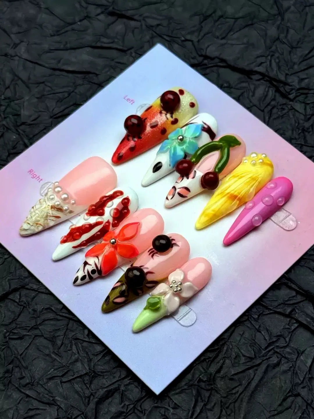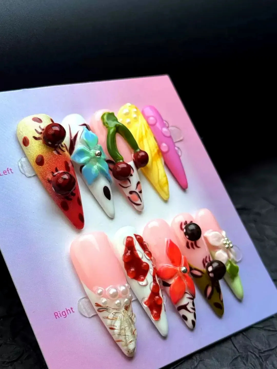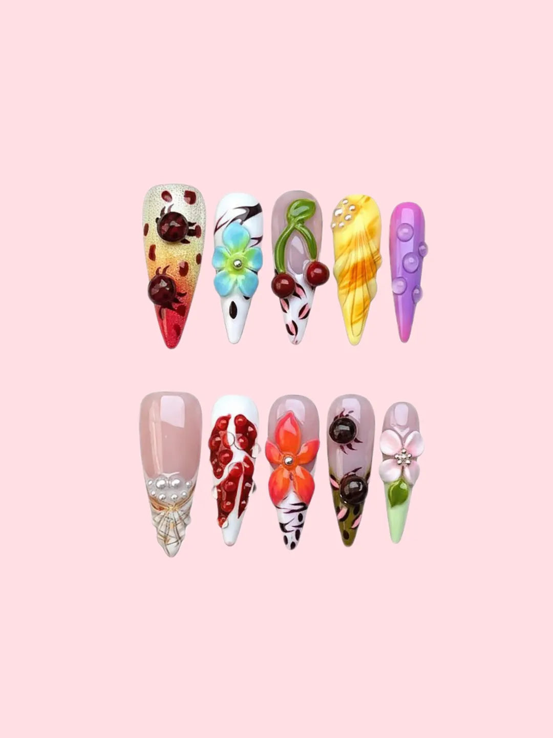 3D Carve nails with dopamine-inspired colors, bright and lively, intricately detailed, perfect for daily wear or parties to showcase personality and style.