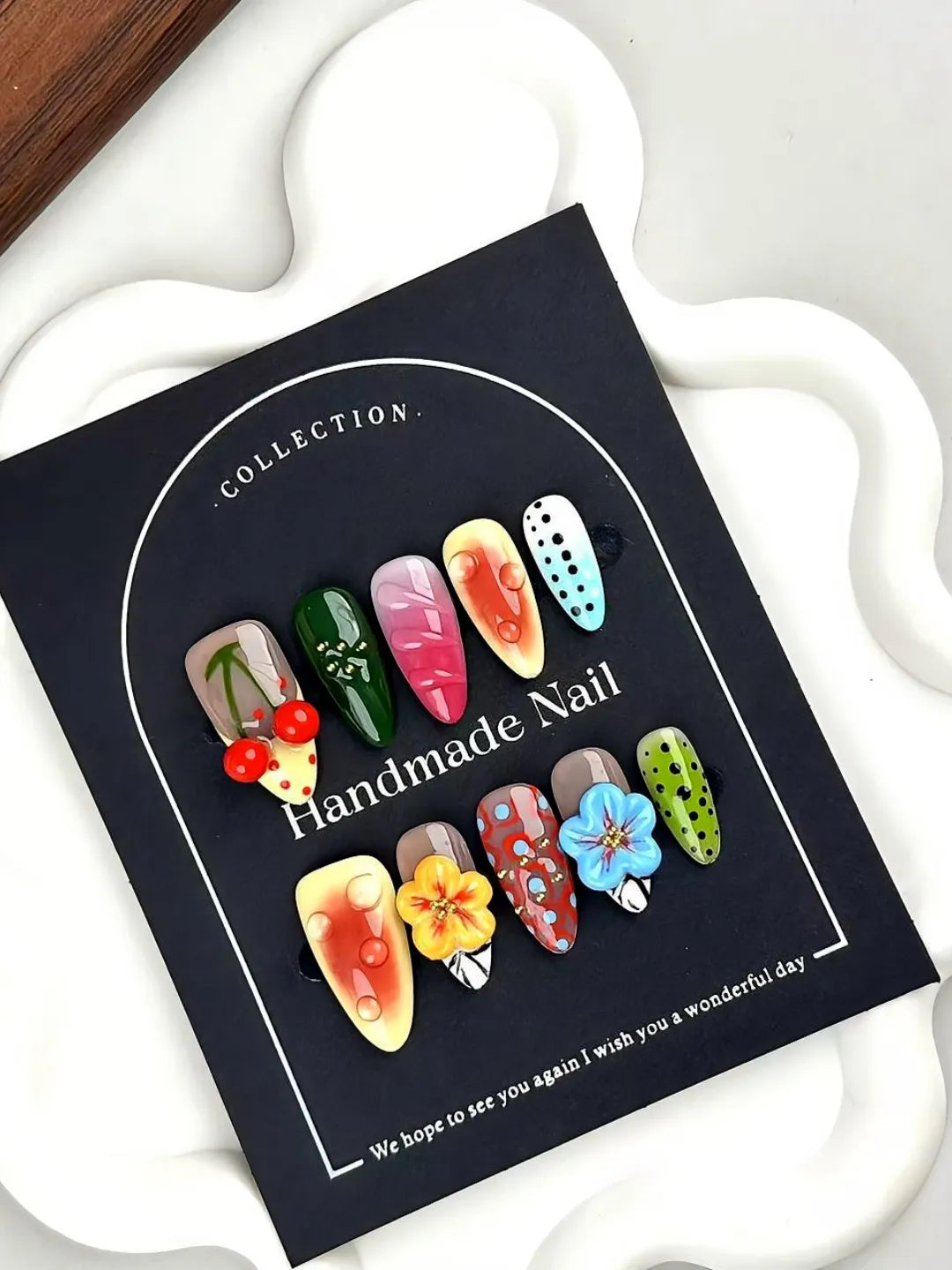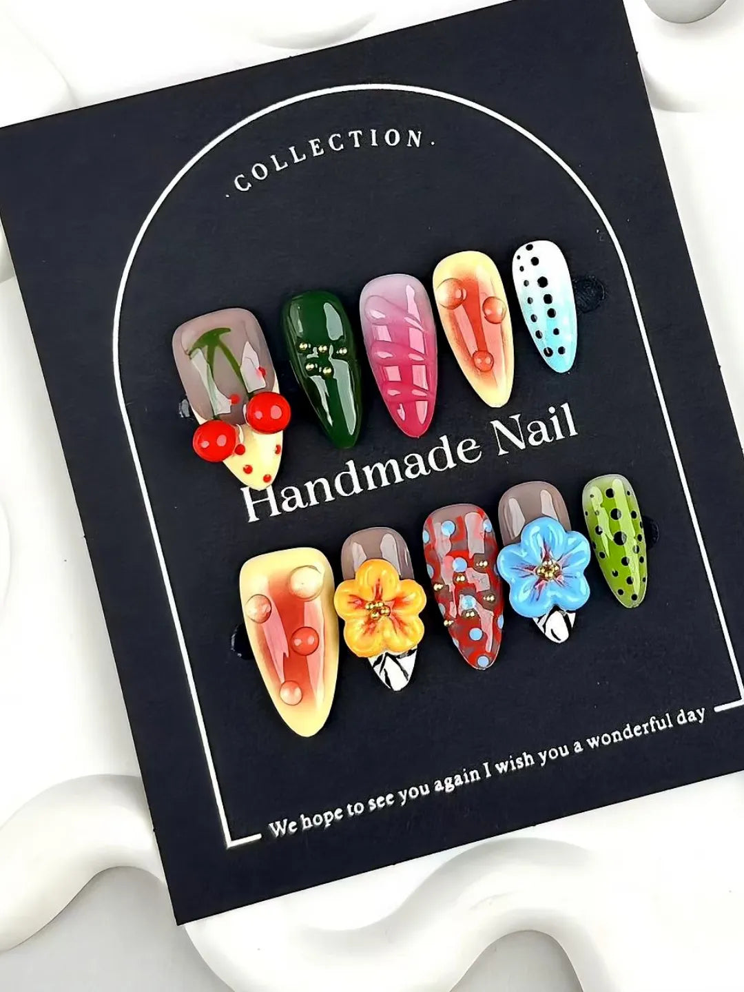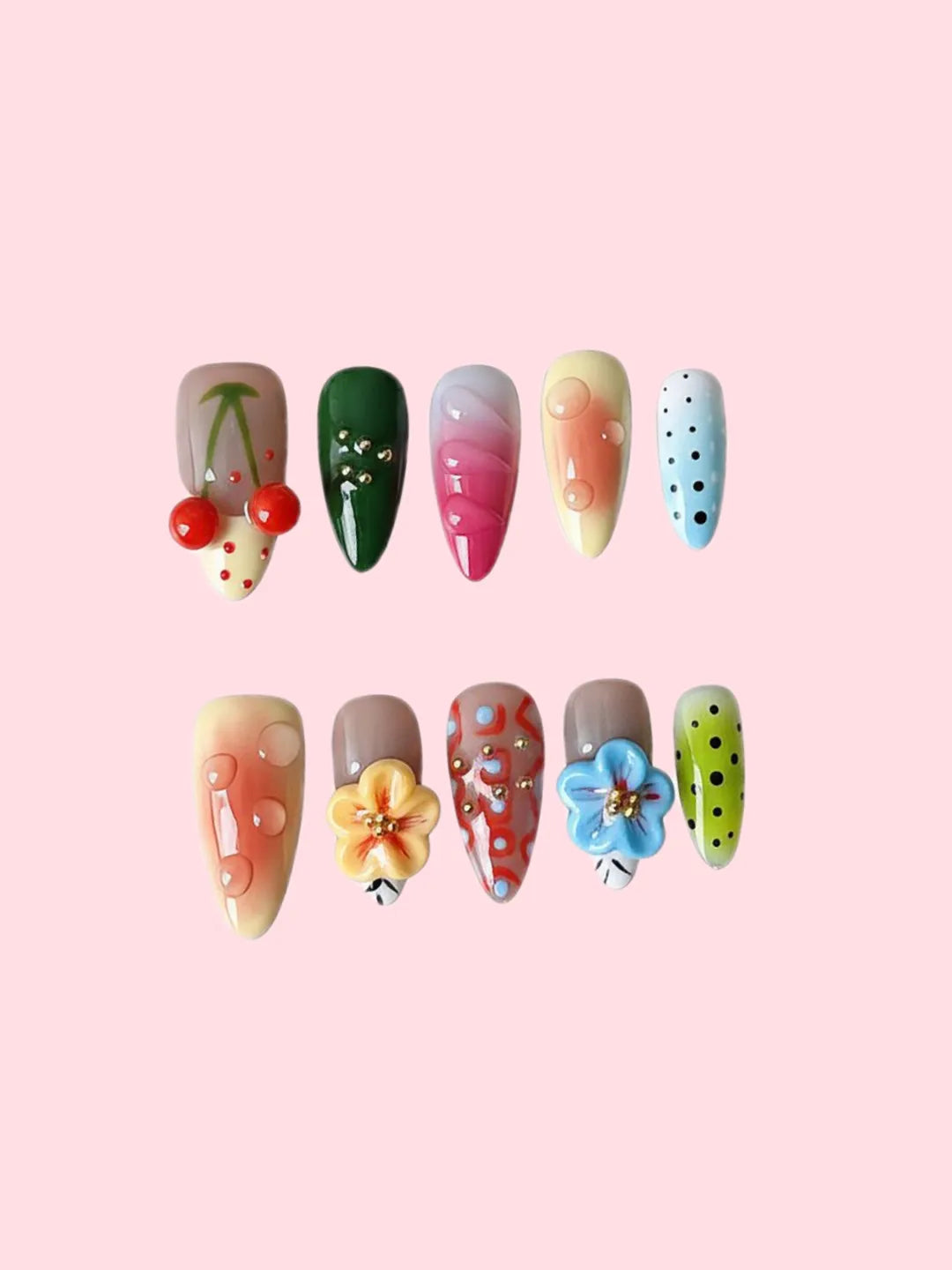 Handmade press-on nails with 3D cherry & flower sculpting, water drop accents, and vibrant cartoon colors. Fun, playful, and perfect for creative looks.