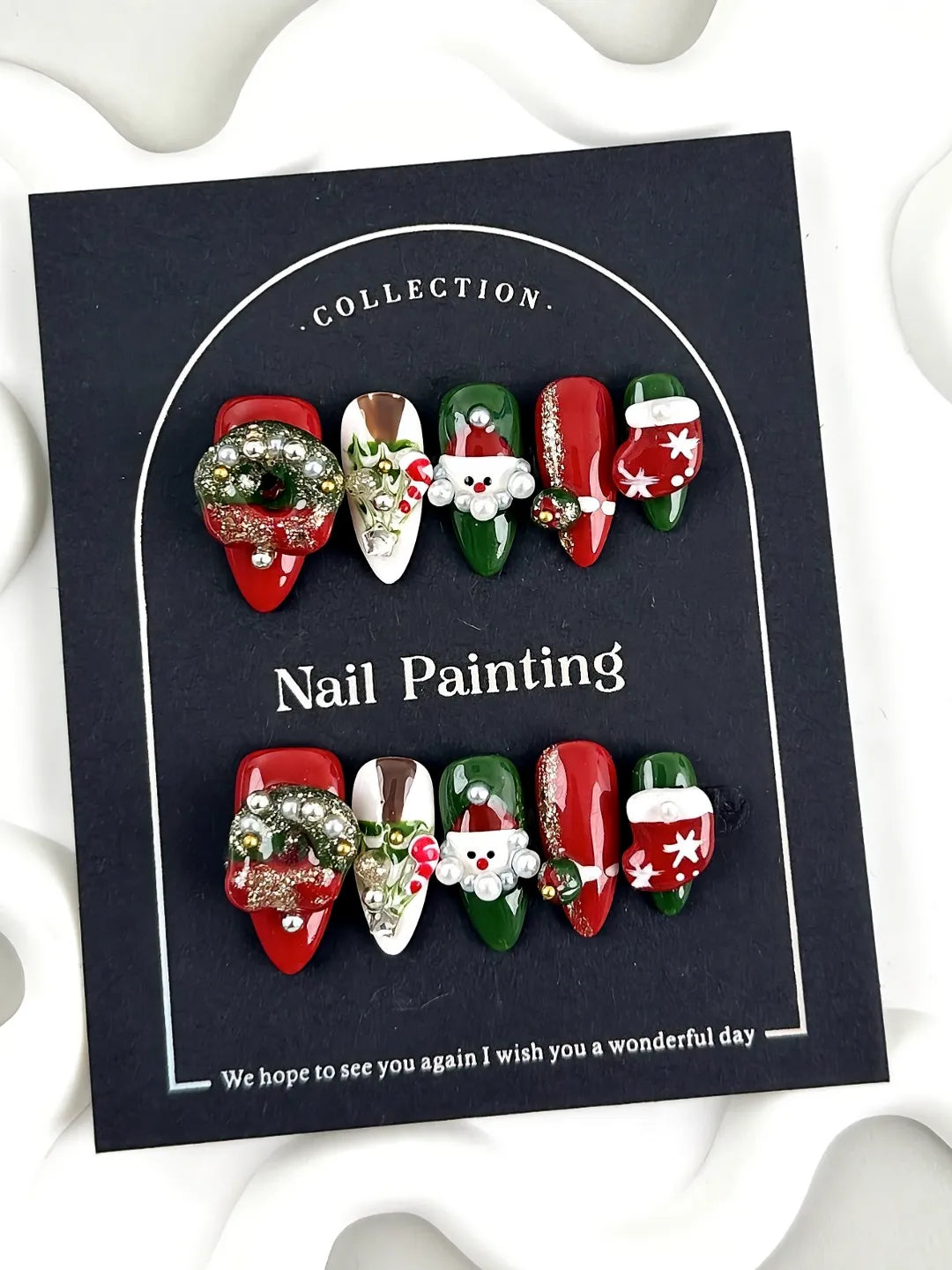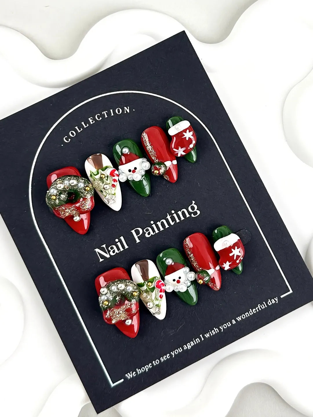 Handmade press-on nails with 3D Santa, candy canes, and festive accents. Detailed, sculpted, and perfect for cheerful, holiday-inspired looks.
