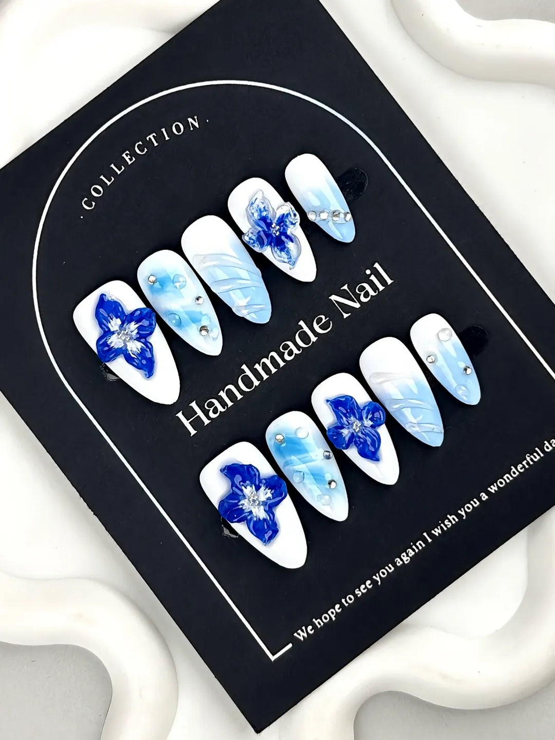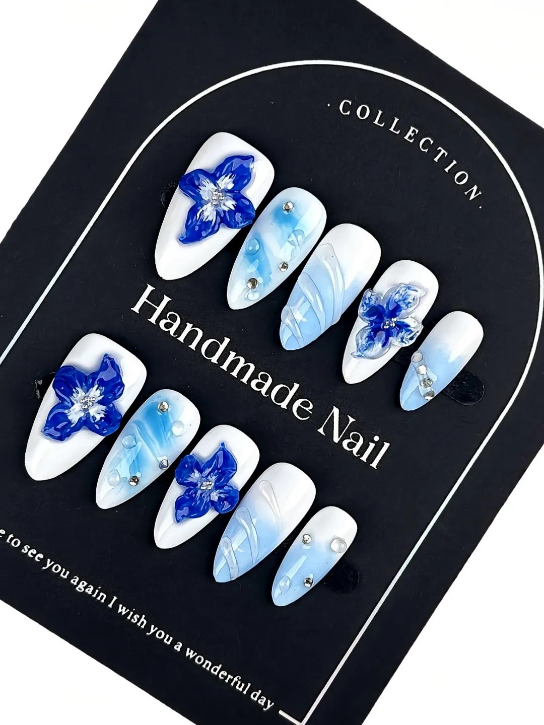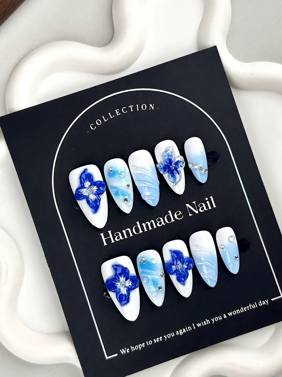 Medium almond nails with 3D blue flowers, blue ombré fades, subtle swirls, and silver rhinestones. Refined, elegant, and artistic design.