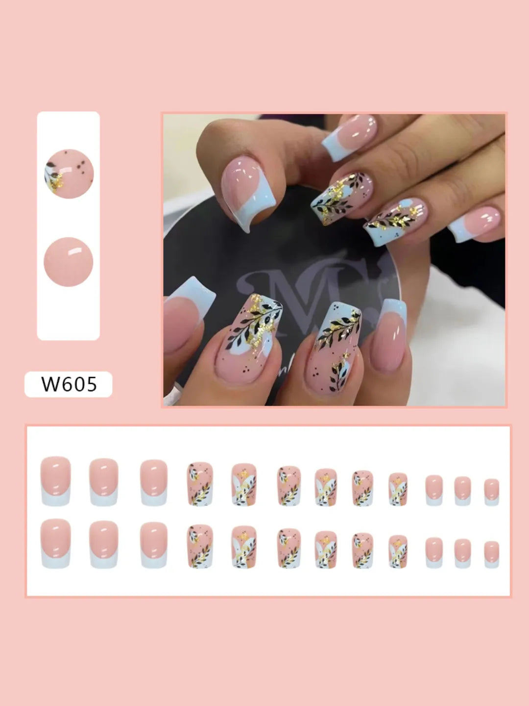 - 24 press-on nails / 24 adhesive pads / 1 nail file / 1 cuticle pusher