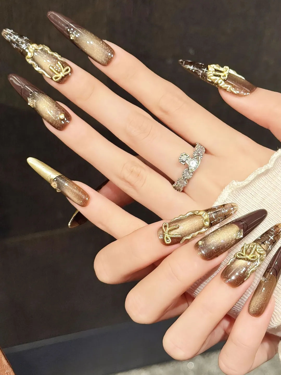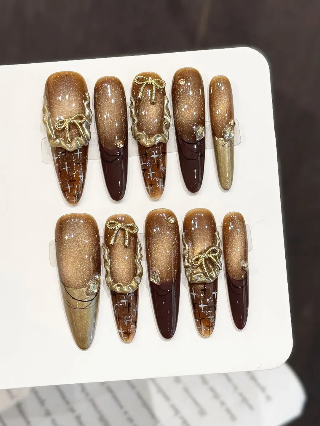 Style:Handmade brown-to-gold gradient nails with lace bow accents, vintage luxury style, elegant and refined, perfect for daily wear or formal occasions.