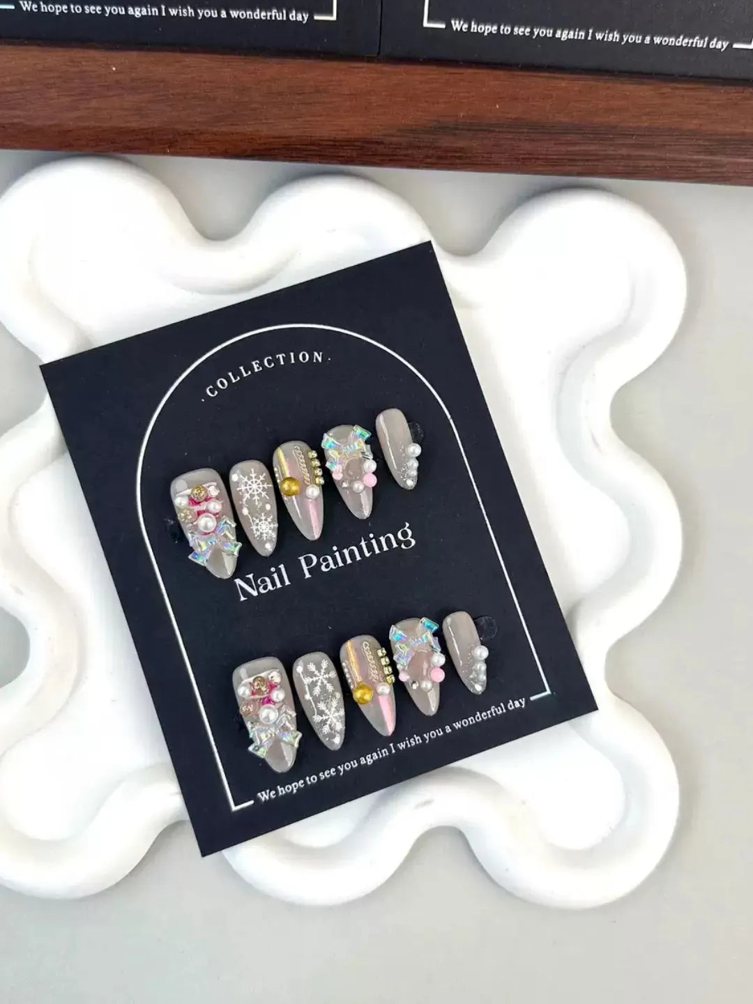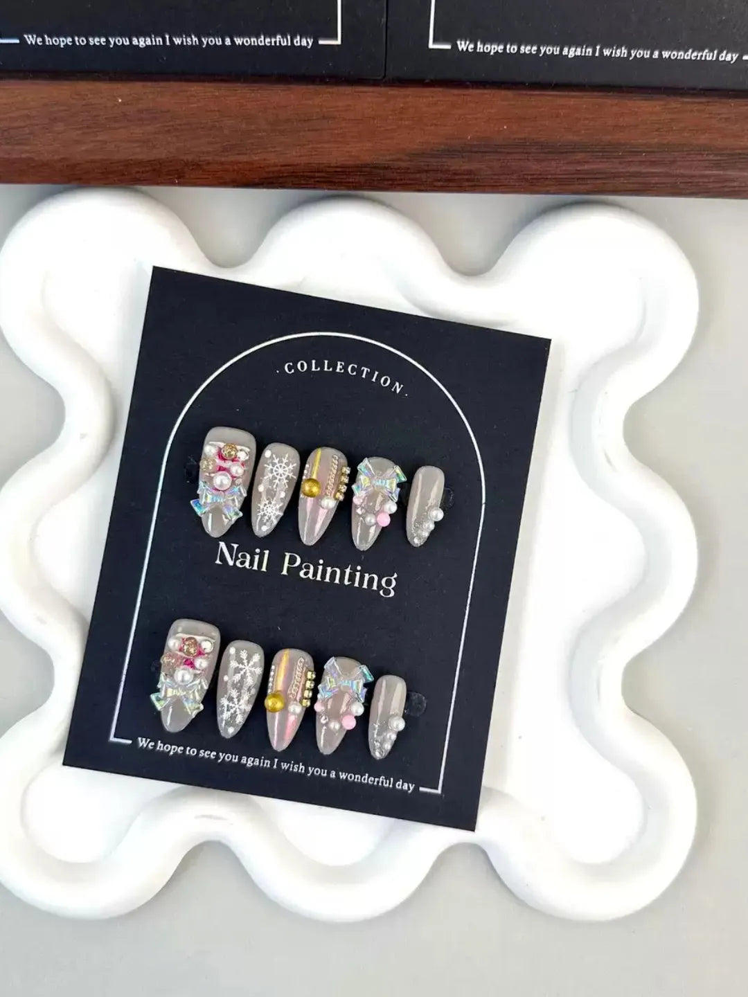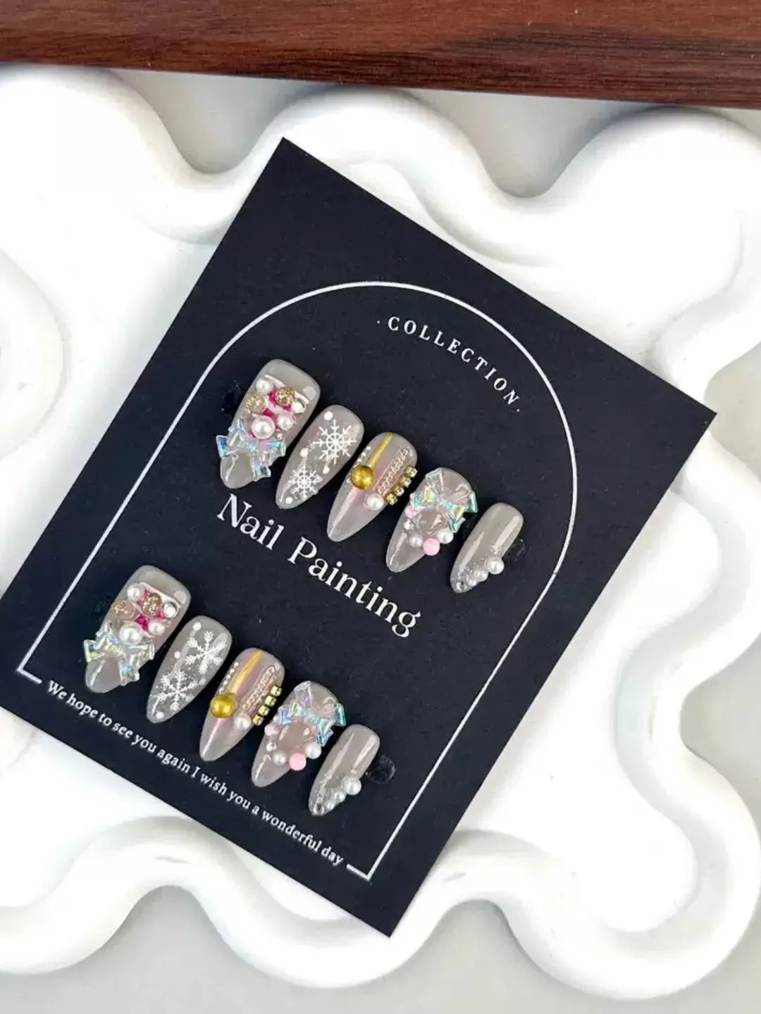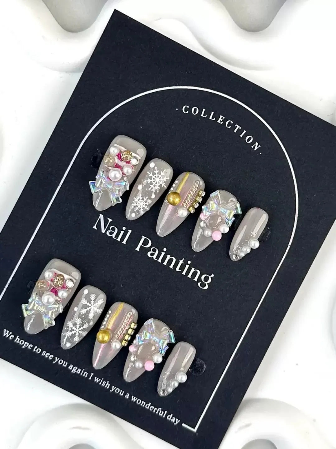 Nude base with hand-painted Christmas details and golden sparkle, subtle yet festive β perfect for winter elegance.