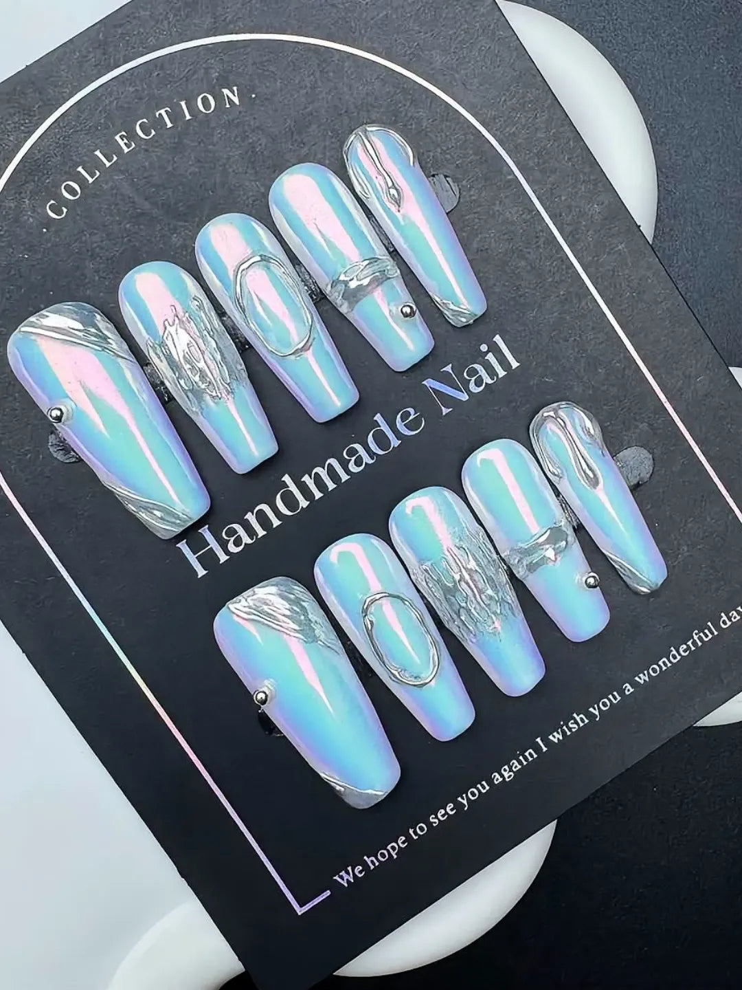 CYBER ALABASTER SET nails feature an alabaster white base with metallic shine, handcrafted long press-ons, sleek and futuristic, perfect for parties, nights out, and special events.