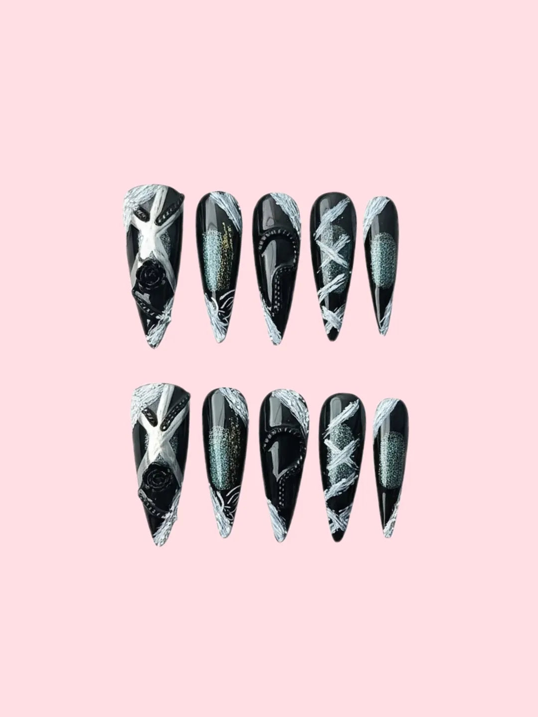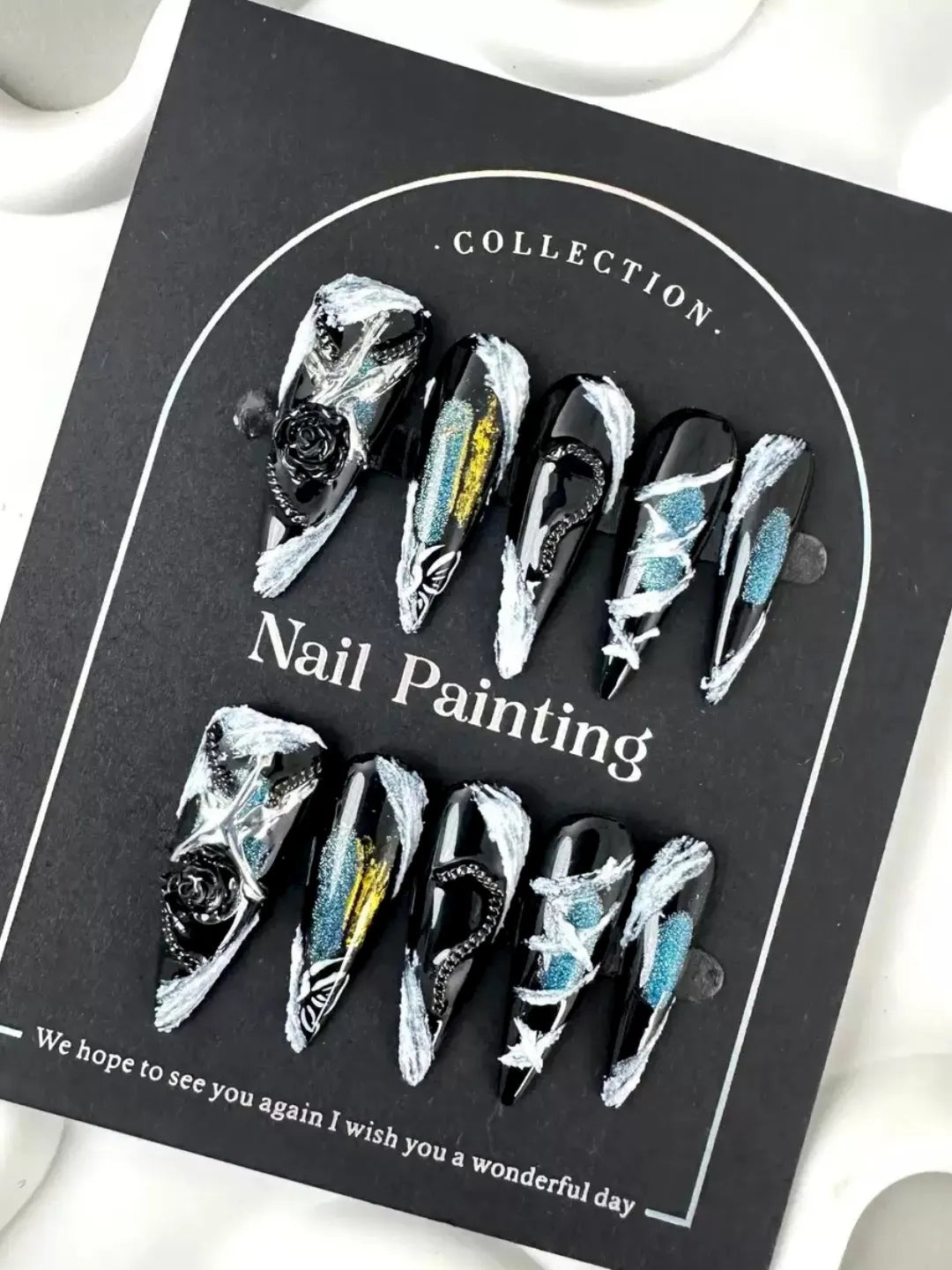 Dark or neon gradient base with hand-painted geometric lines and metallic accents β edgy and futuristic, perfect for daily wear or parties.