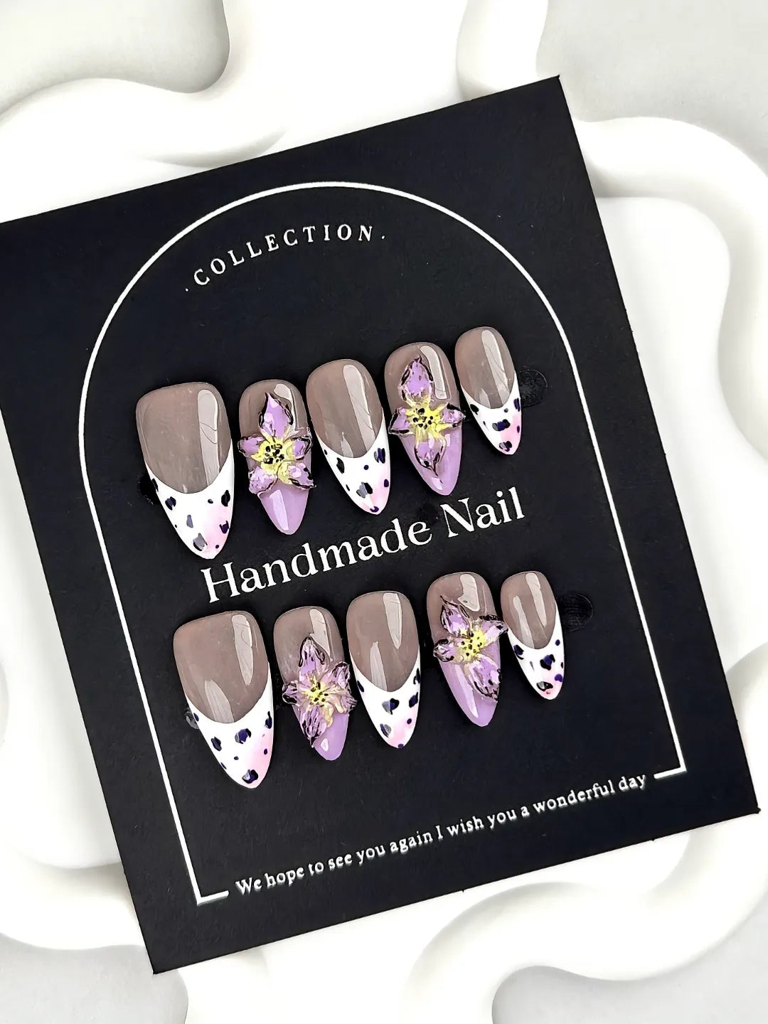 Short/medium oval nails with nude bases, cow-print French tips, and 3D purple flower accents. Cute, playful, and whimsical flower-power style.