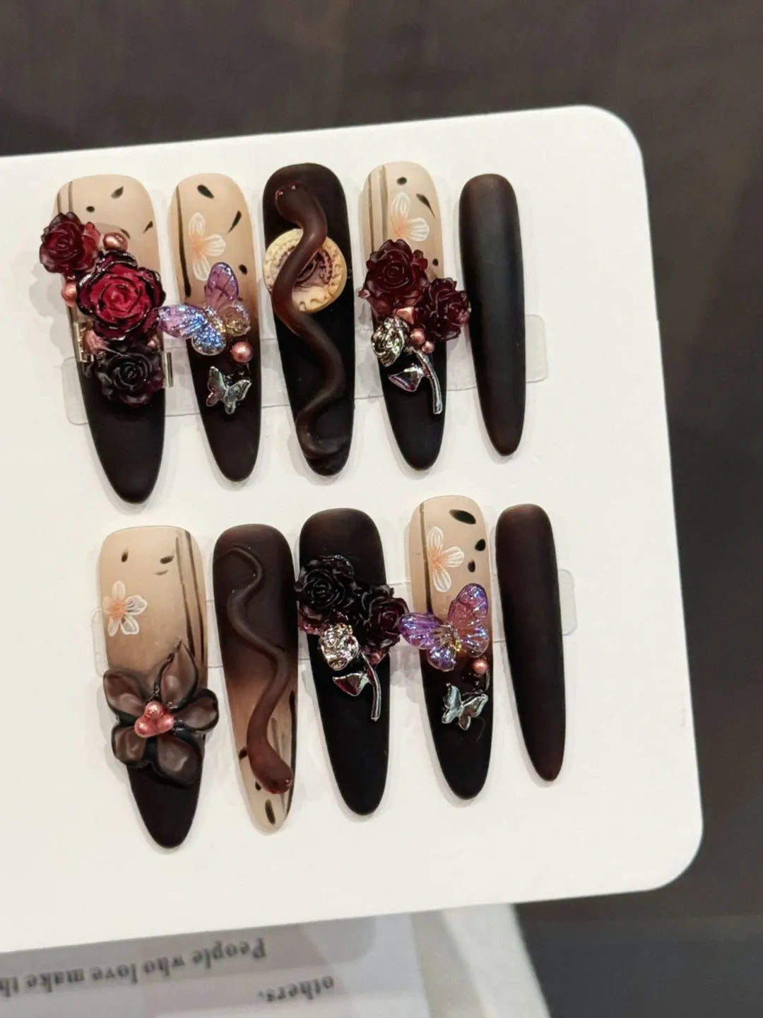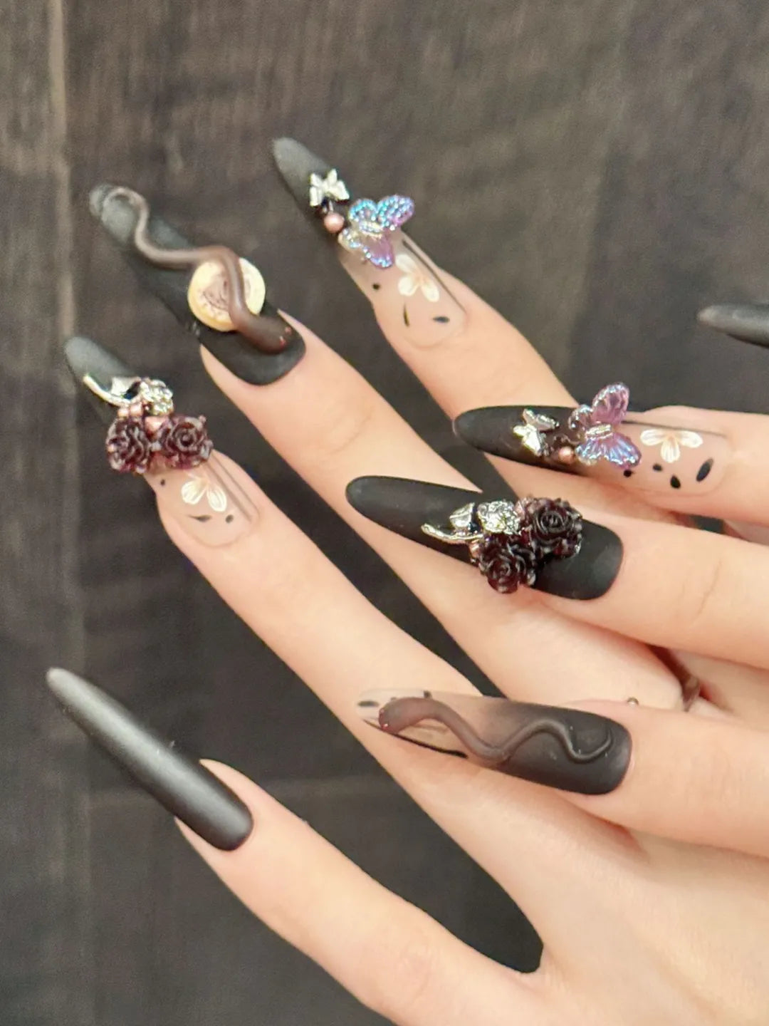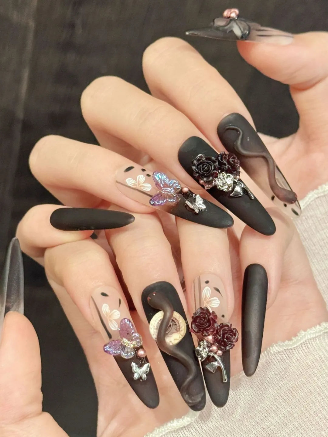 Style:Designed with dark serpent and rose elements to create a mysterious and alluring nail look.