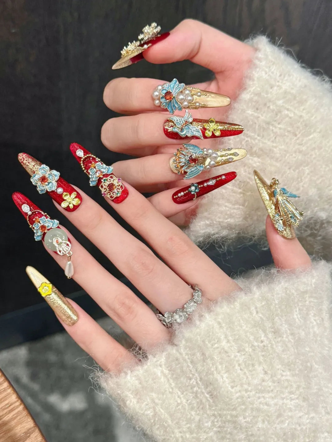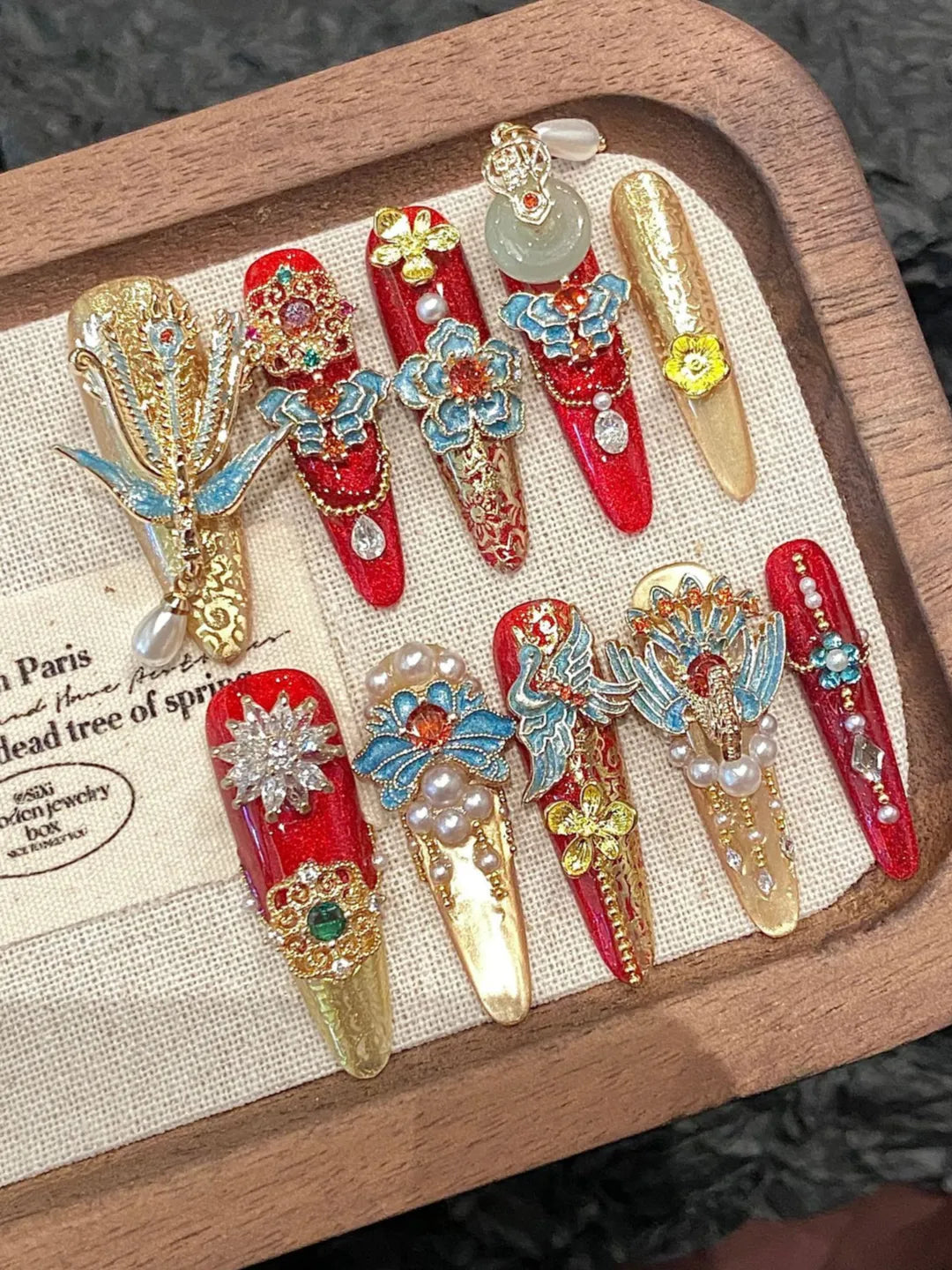 Style:Luxurious bridal nails with full diamond details, cat-eye effect, and handcrafted design, removable long style, showcasing elegance and exquisite craftsmanship.