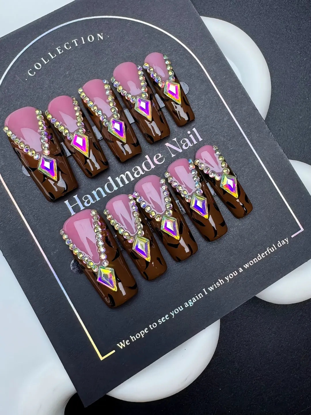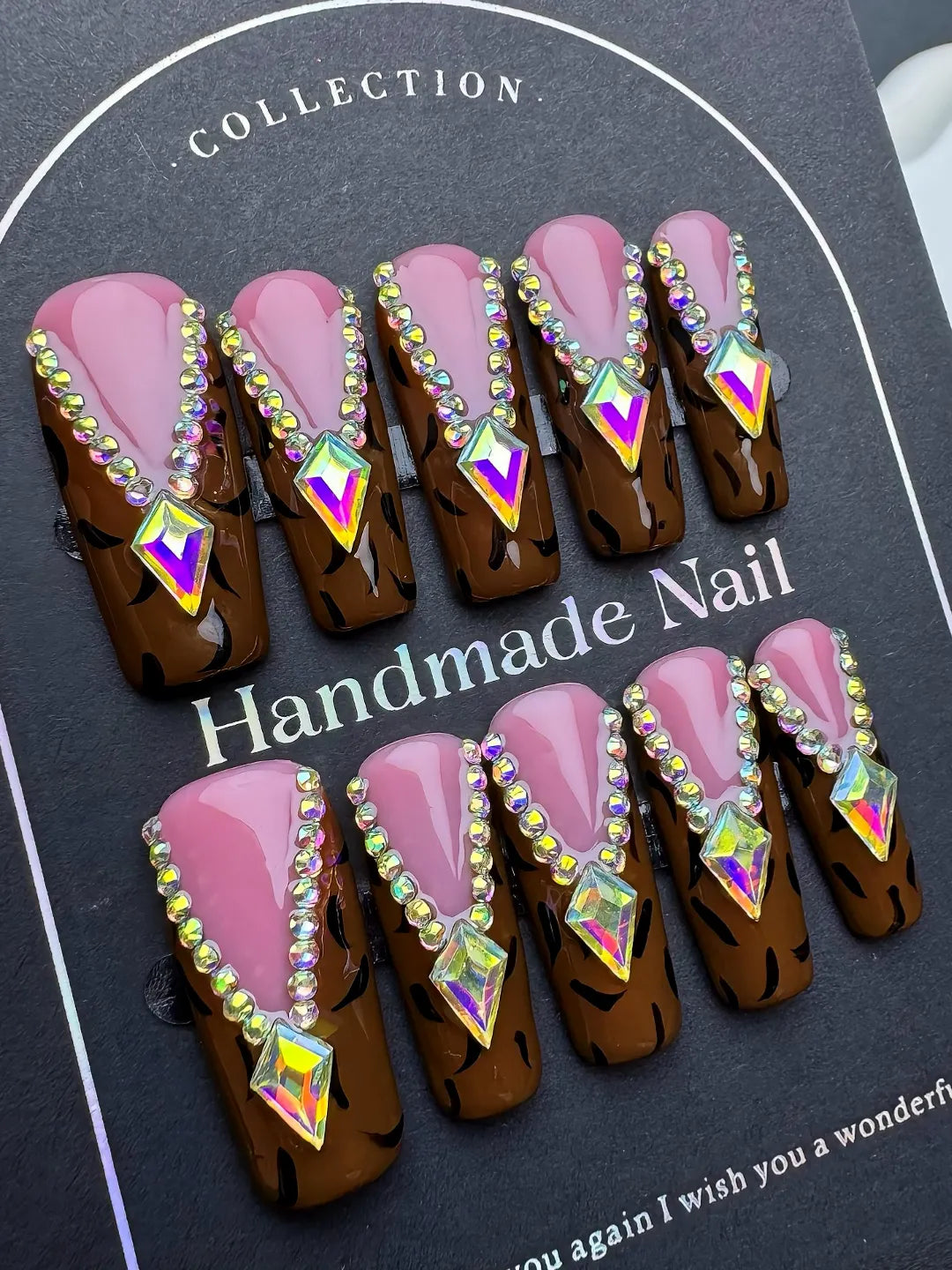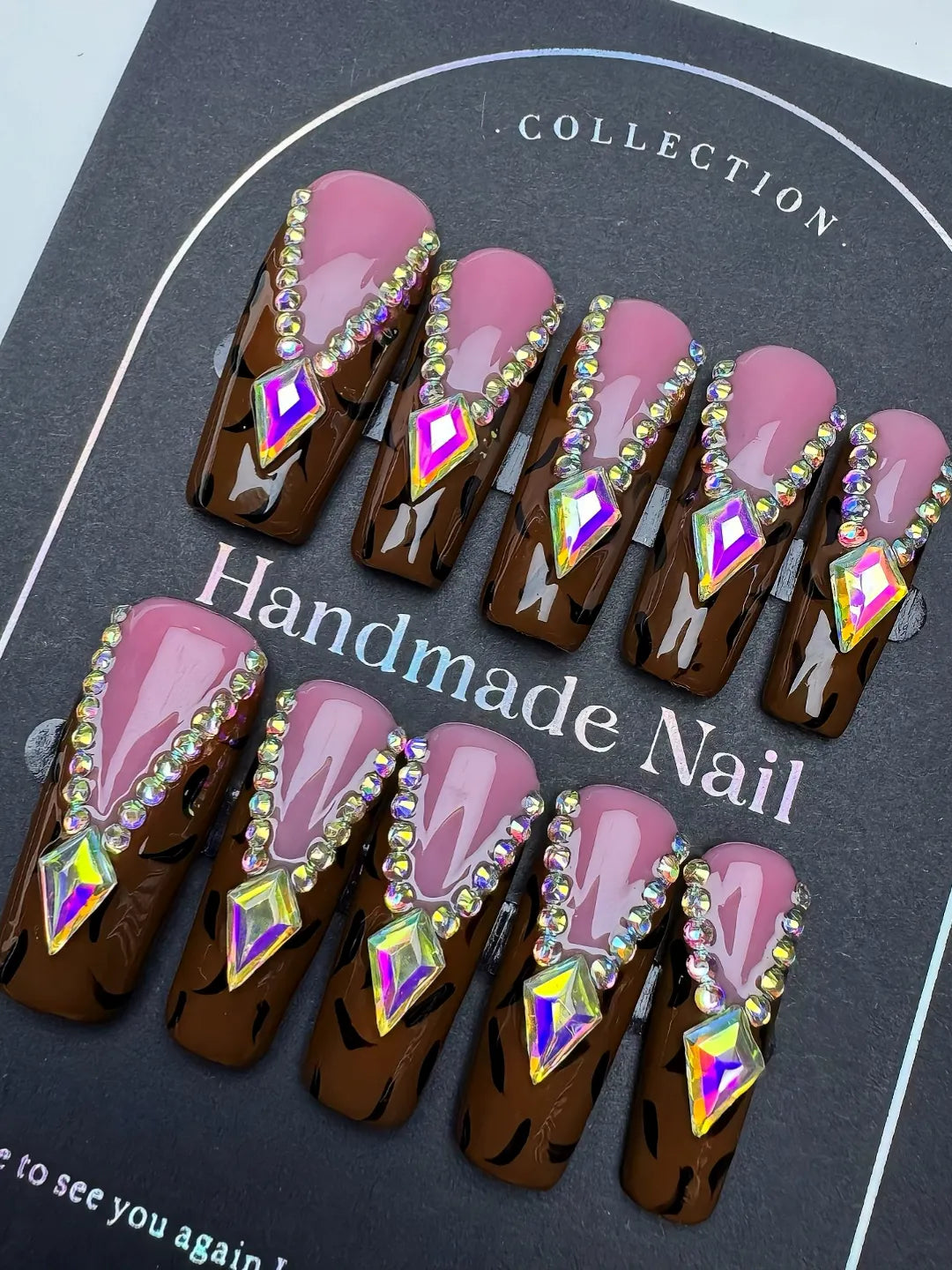 Handmade press-on nails with leopard print and sparkling diamond accents. Bold, glamorous, and perfect for standout, fashionable looks.