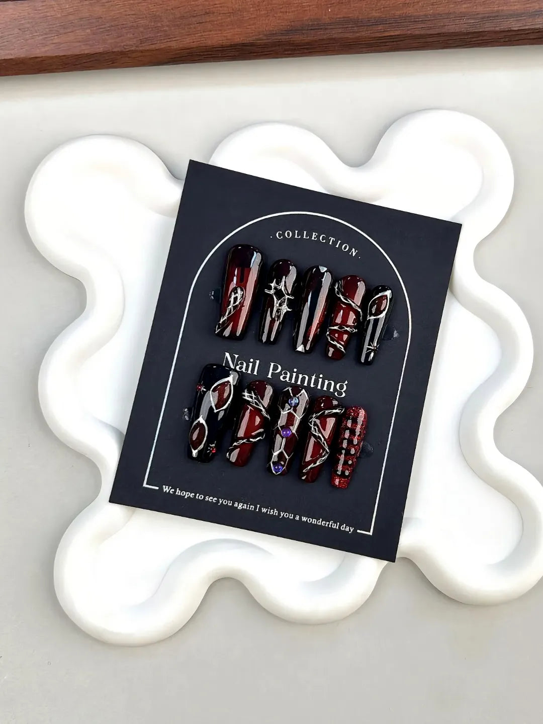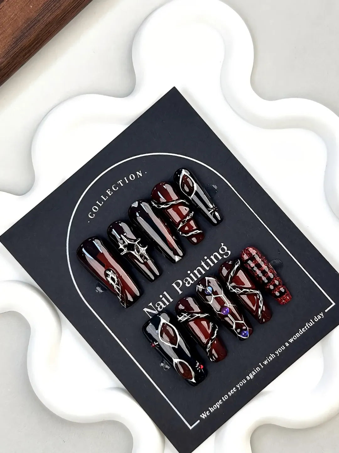 Handmade press-on nails with hand-sculpted elements. Bold, dark, and gothic with red mushroom accents for a mysterious and edgy look.
