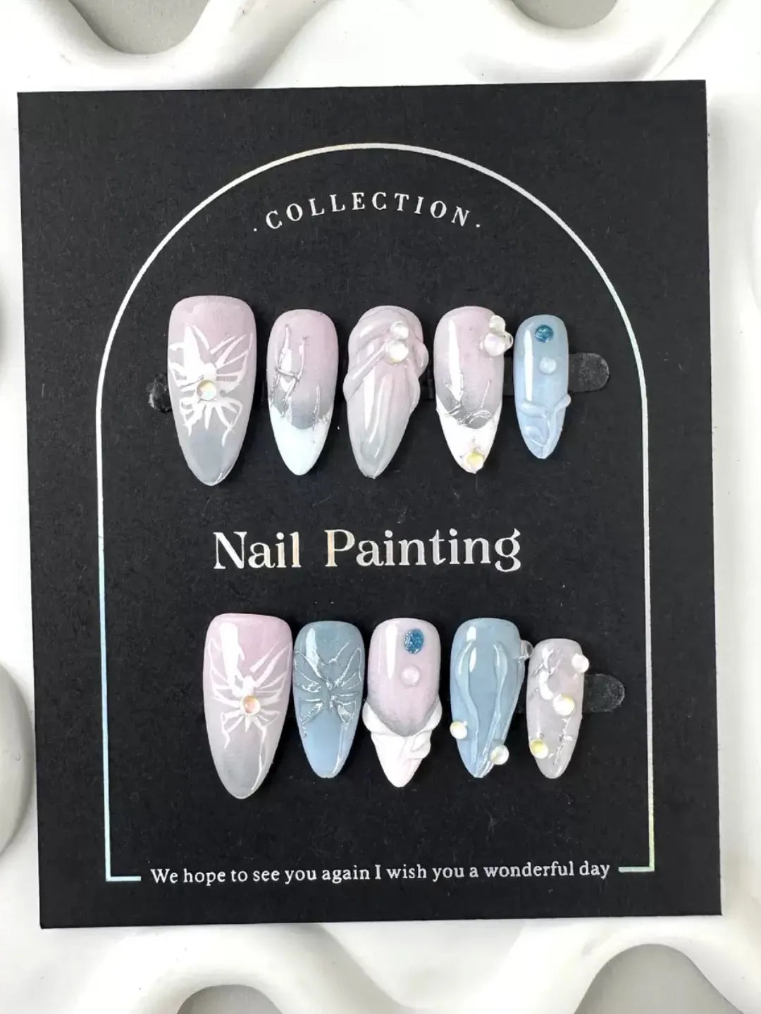 Gradient base with hand-painted butterflies and subtle shimmer β delicate and romantic, perfect for daily wear or dates.