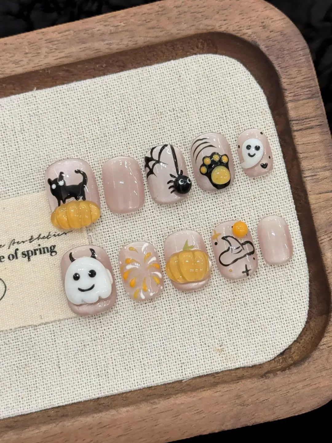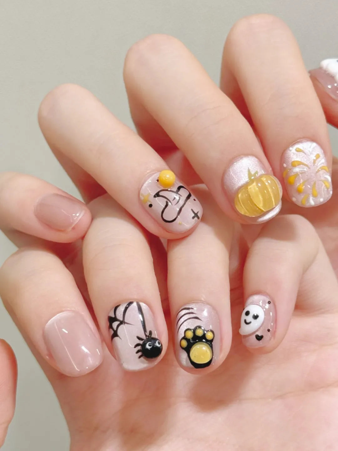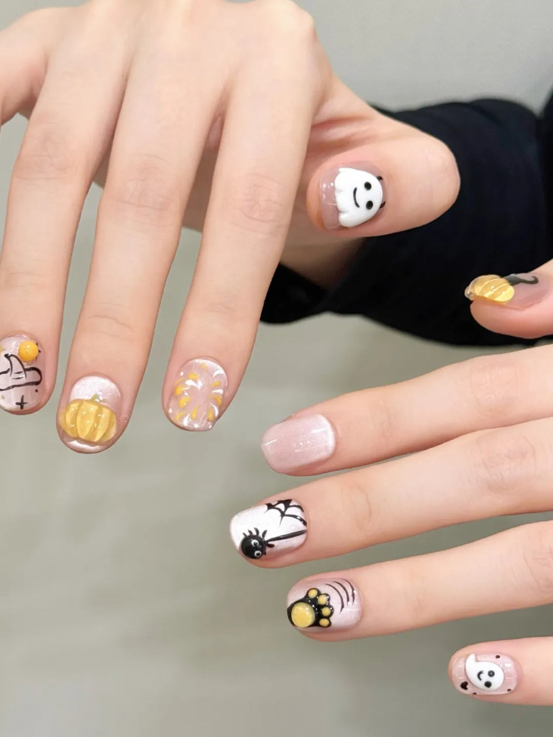 YIHE Halloween Ghost handmade press-on nails with 3D squishy black cat, pumpkin, and spider designs, festive and playful, perfect for Halloween parties, retail, and cross-border sales.