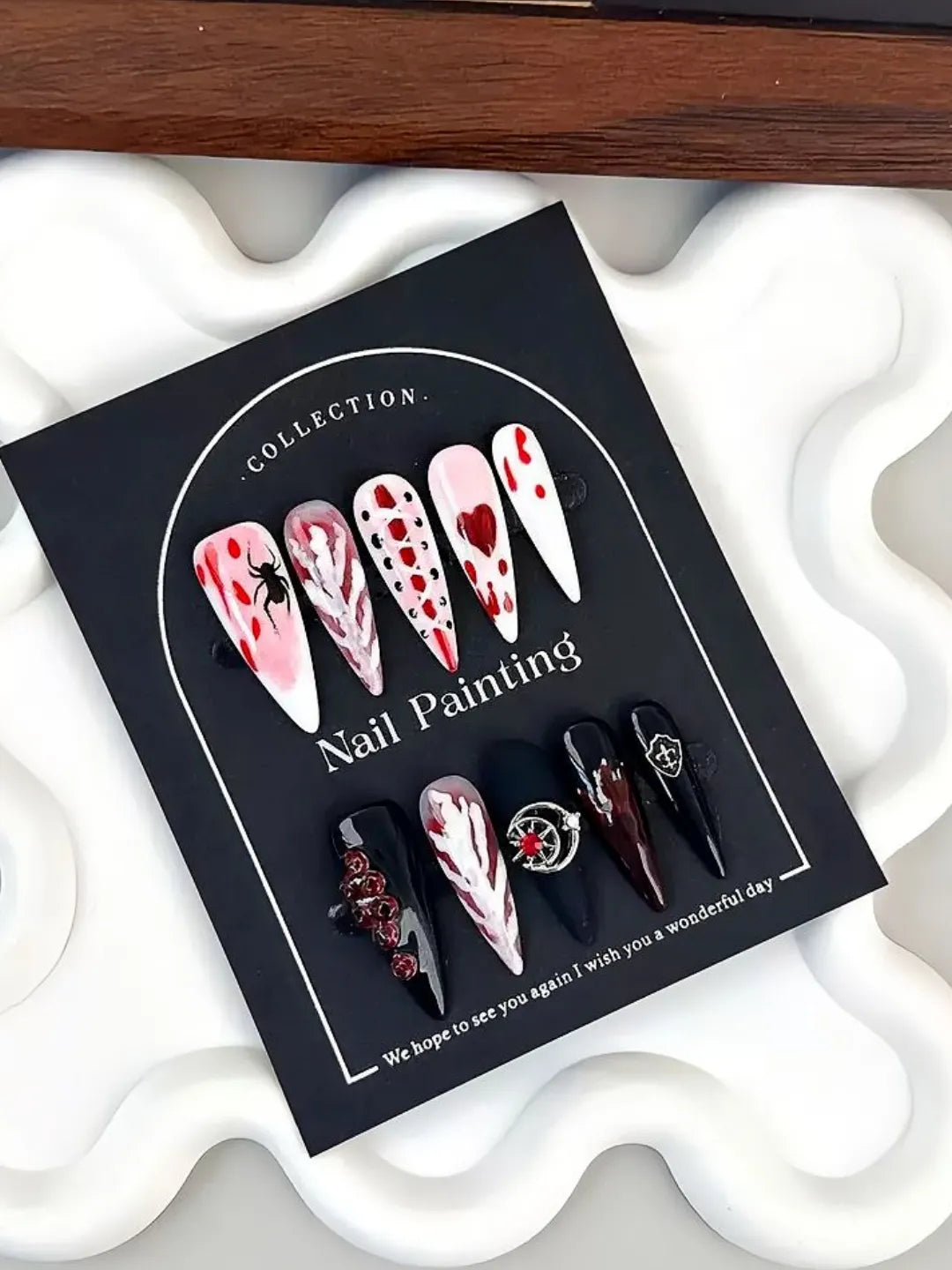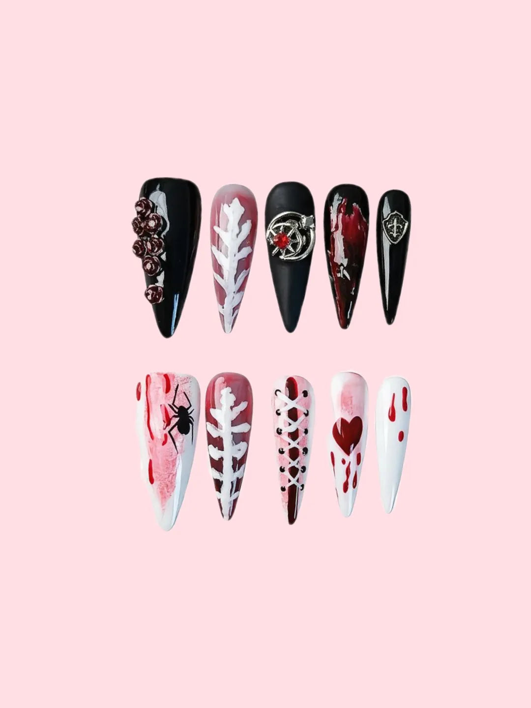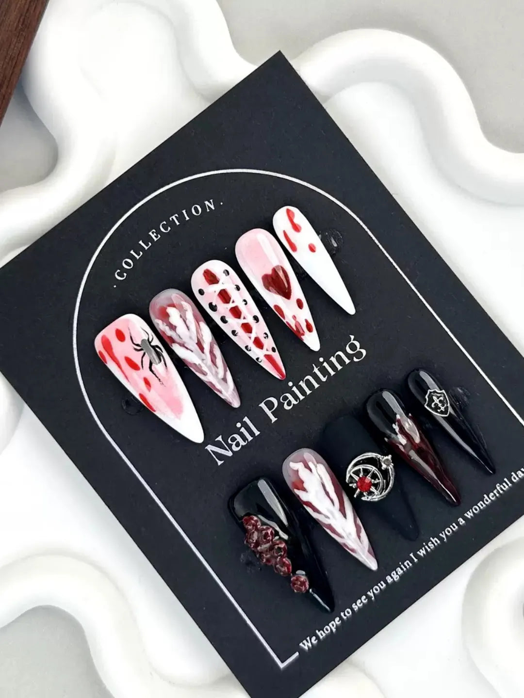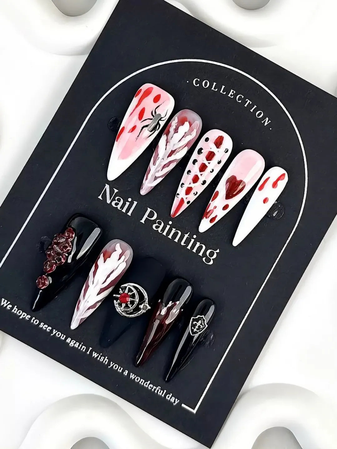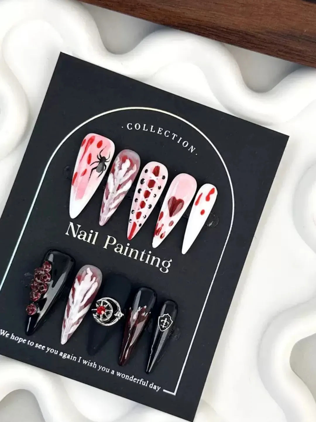 Halloween Night nails feature deep tones with spider and web details, subtle yet striking β the perfect mix of mystery and elegance for your Halloween look.