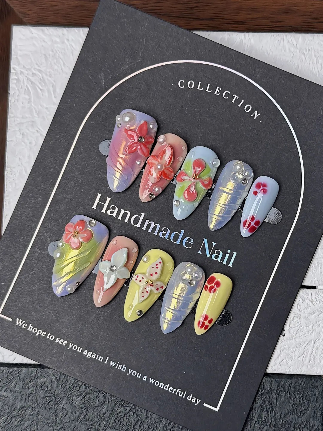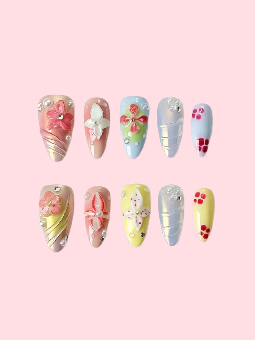 Handmade press-on nails with 3D flowers, pearls, and iridescent shimmer. Bright, whimsical, and perfect for spring and summer looks.