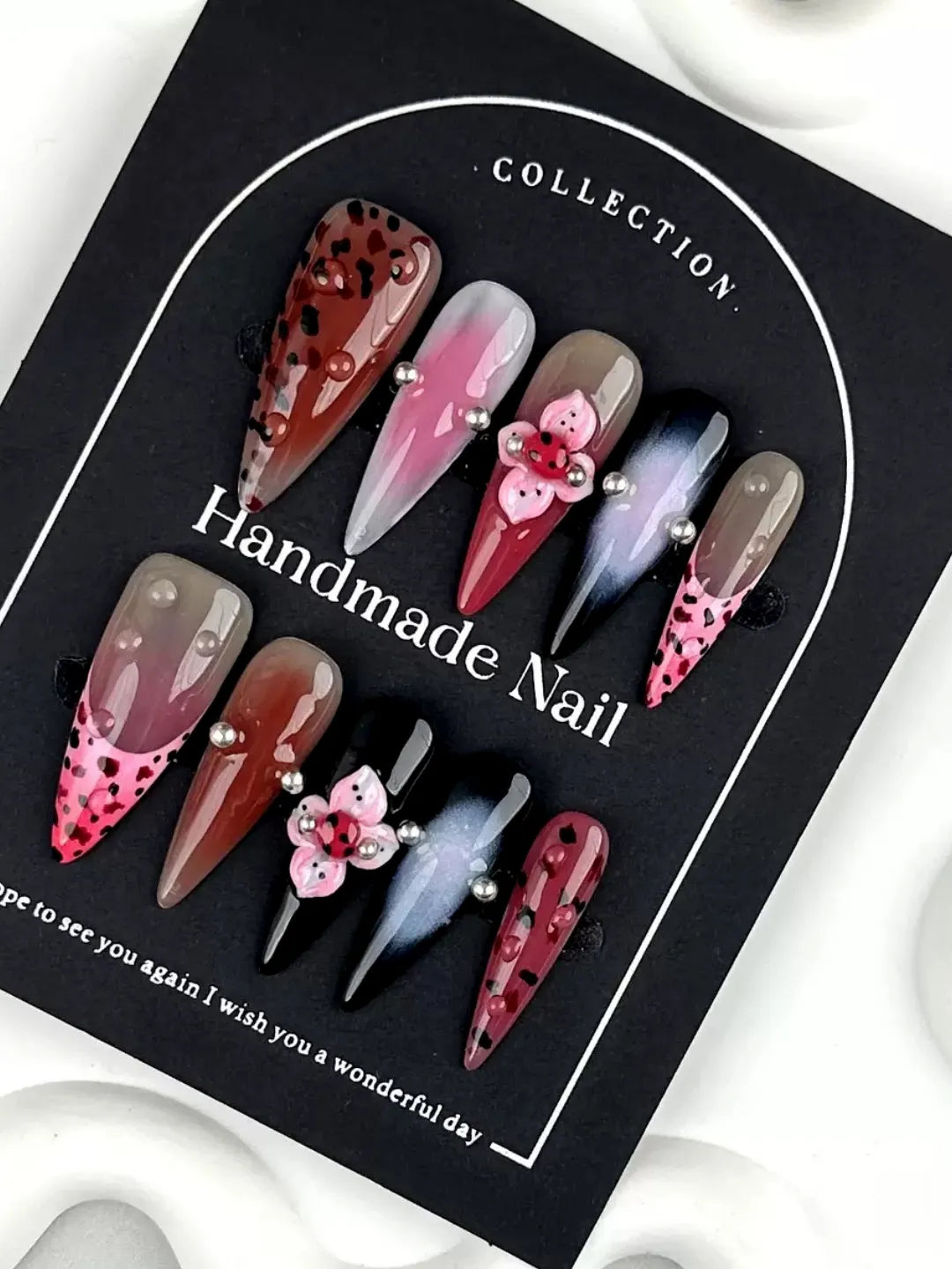 Warm gradient or nude base with hand-painted leopard patterns and 3D carved details β bold yet refined, perfect for daily wear or parties.
