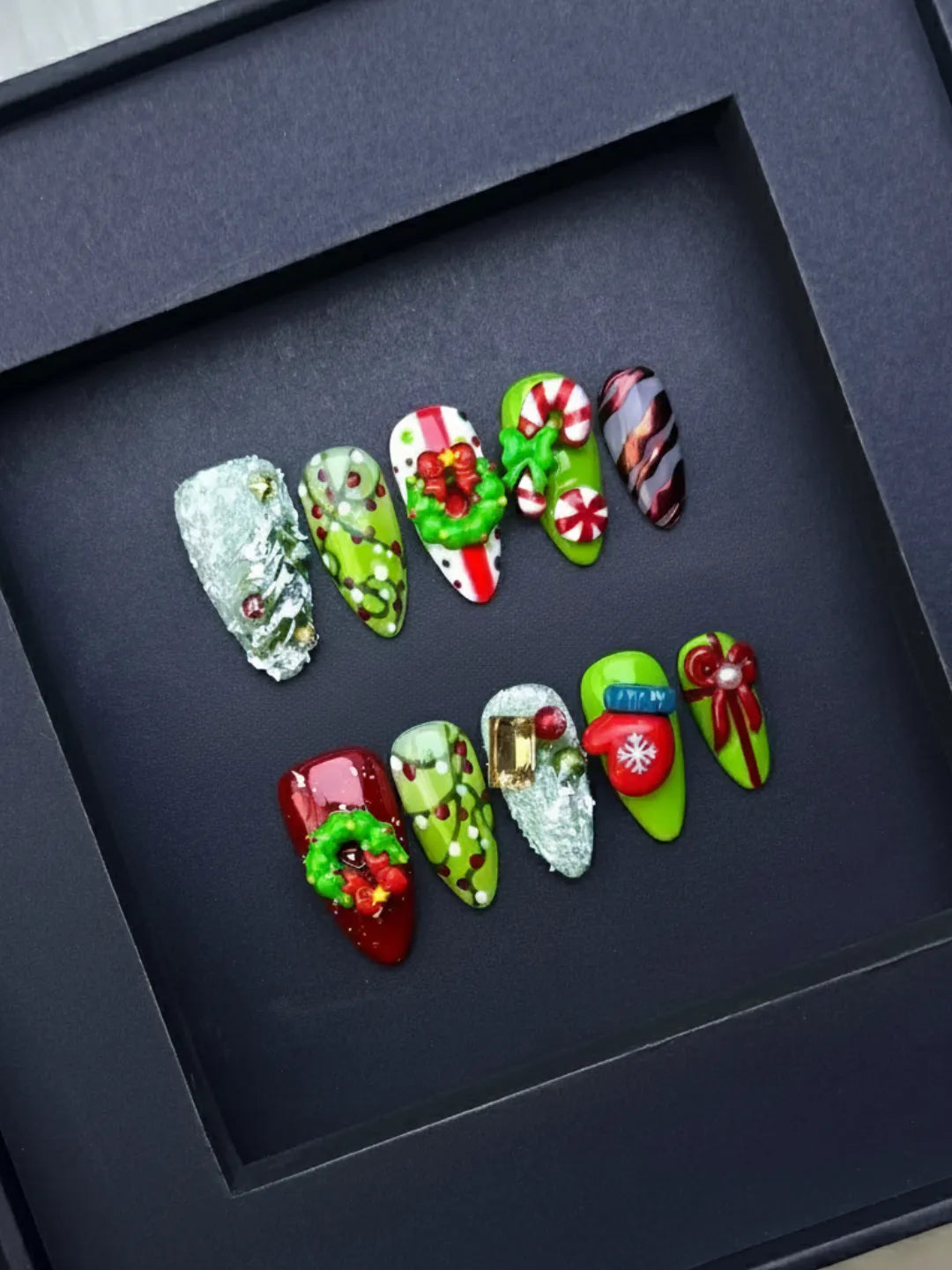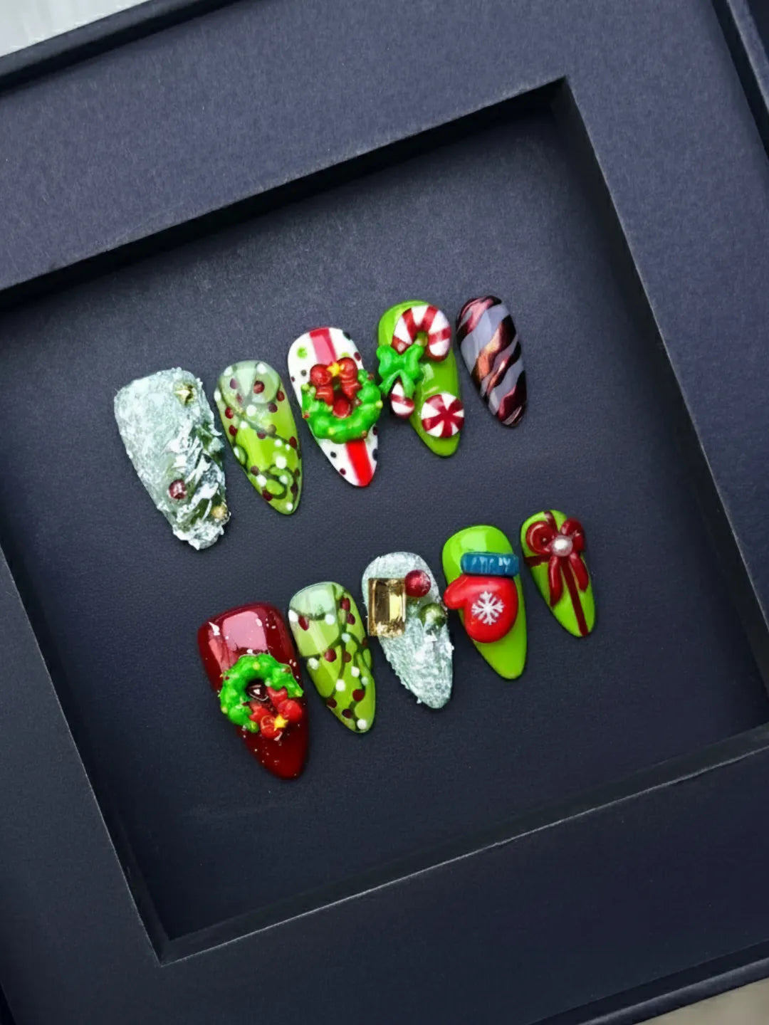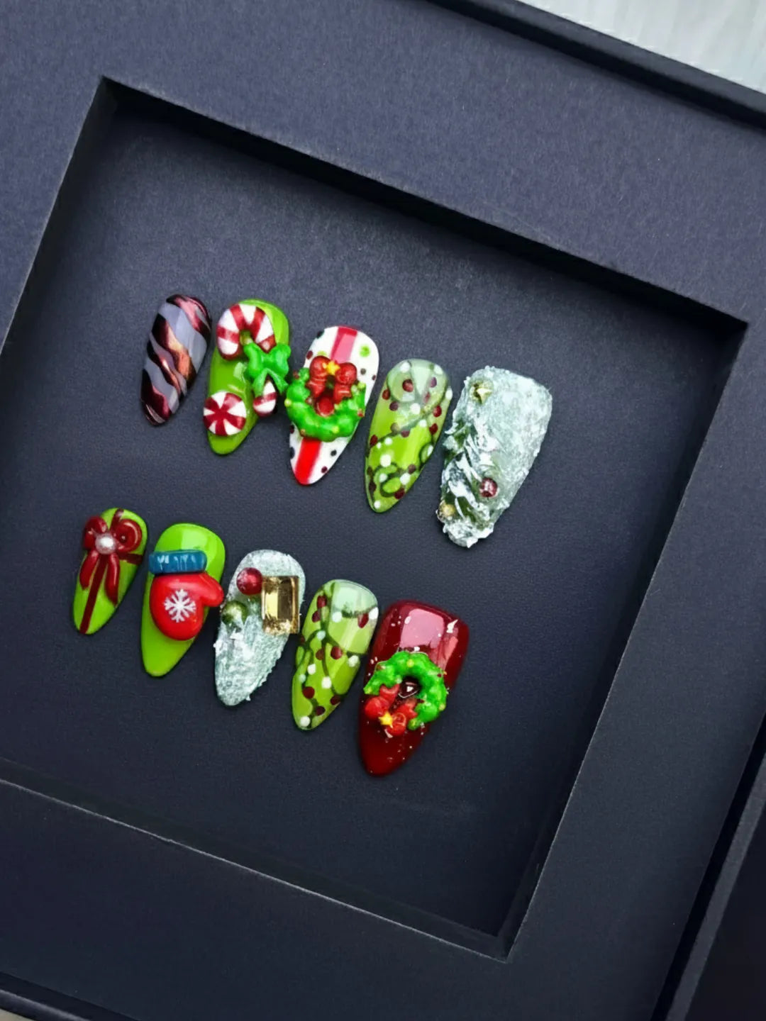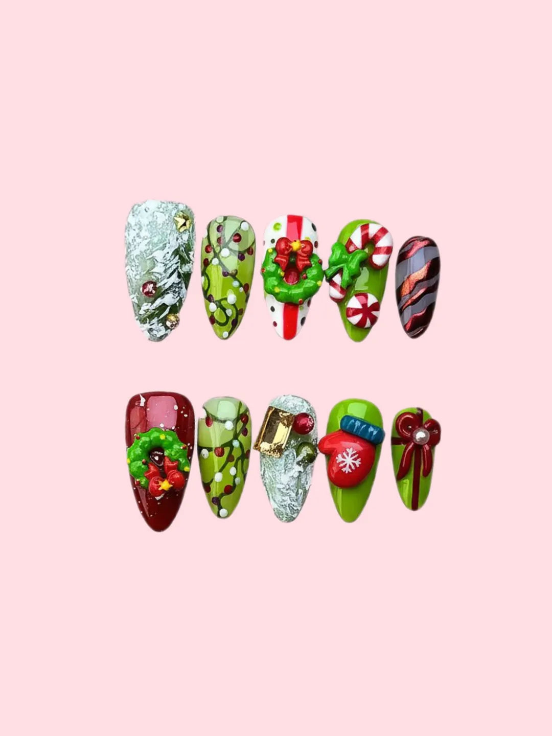 Merry Christmas nails feature red and green hues with delicate hand-painted details β cozy, festive, and full of holiday warmth.