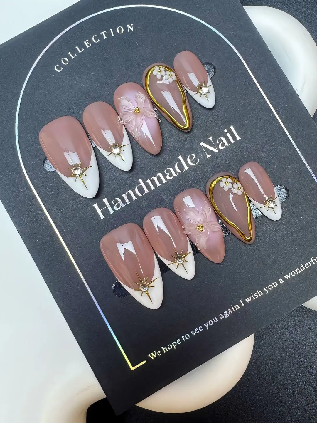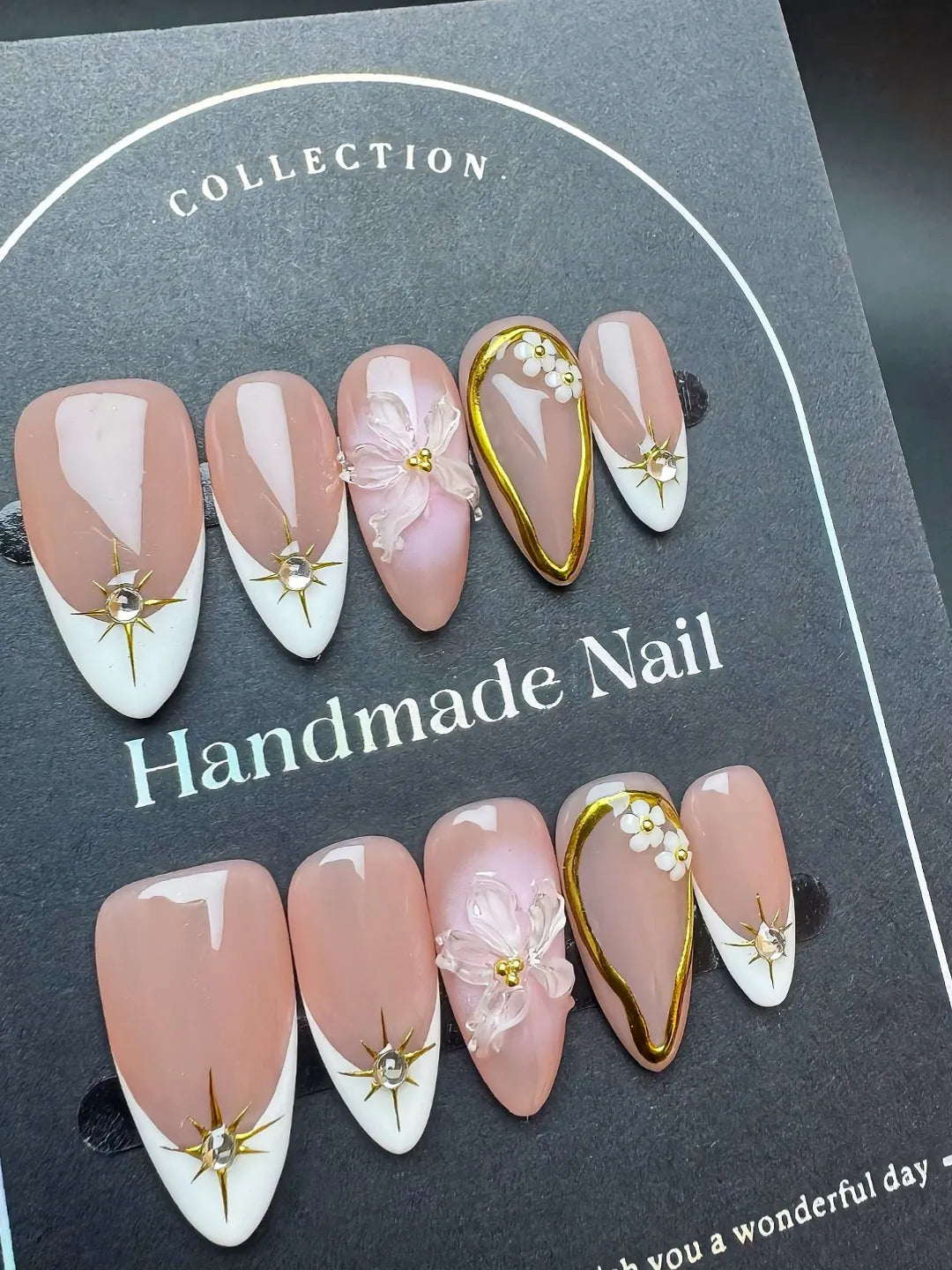Handmade press-on nails with soft nude tones, French tips, gold accents, and delicate 3D flowers. Elegant, chic, and perfect for sophisticated looks.