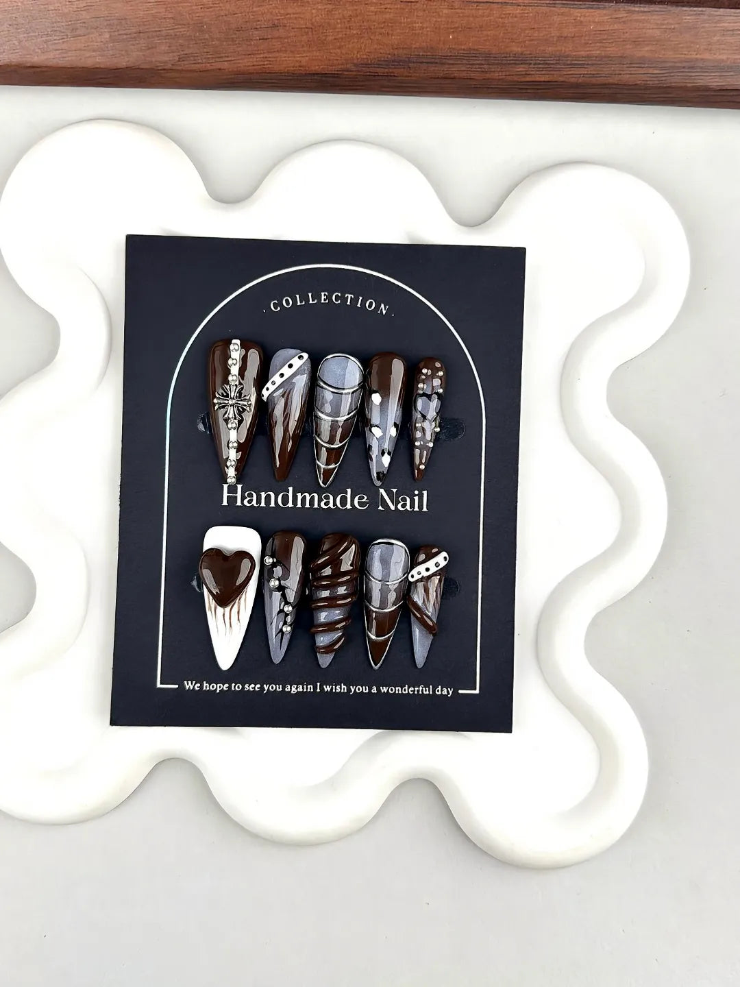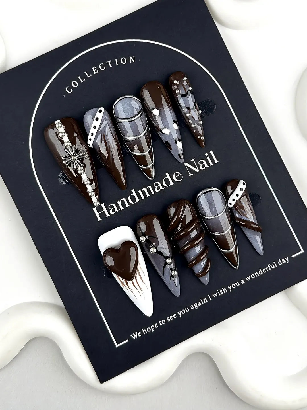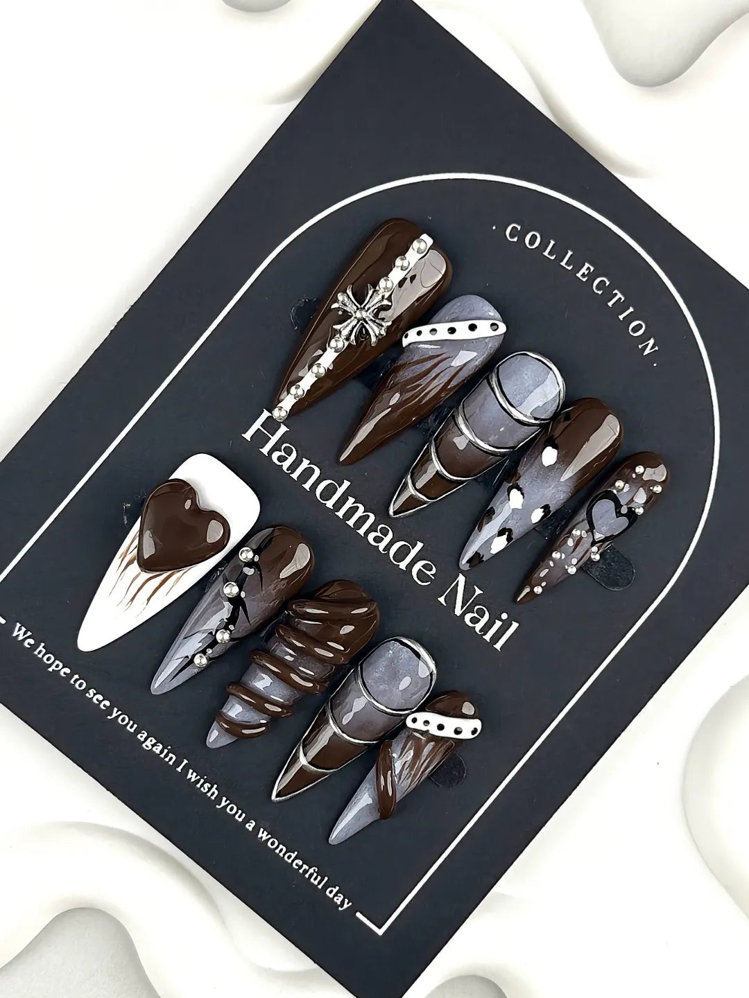 Long stiletto nails with 3D chocolate swirls, white heart, silver cross charm, metallic stripes, and animal print accents. Edgy, gothic, and warm.