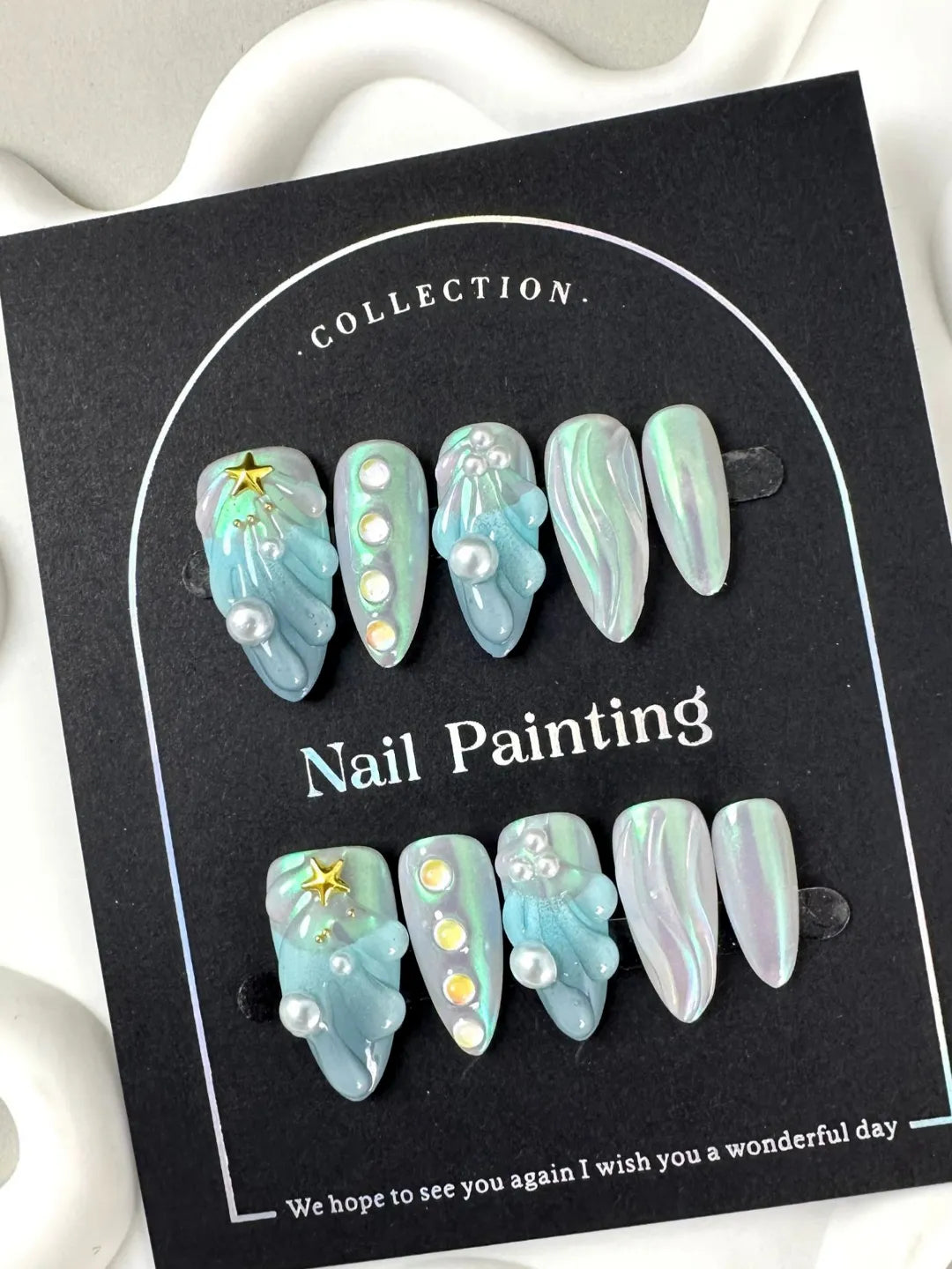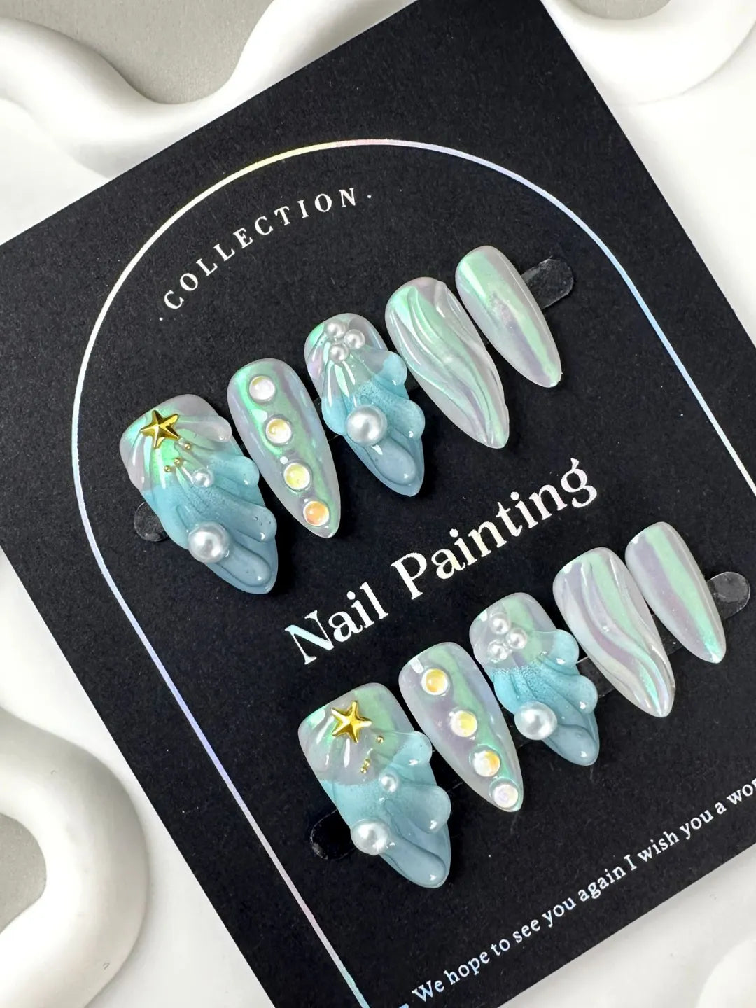 Ocean Shell nails feature blue gradients with delicate shell details, creating a fresh seaside vibe, perfect for daily wear or vacations.