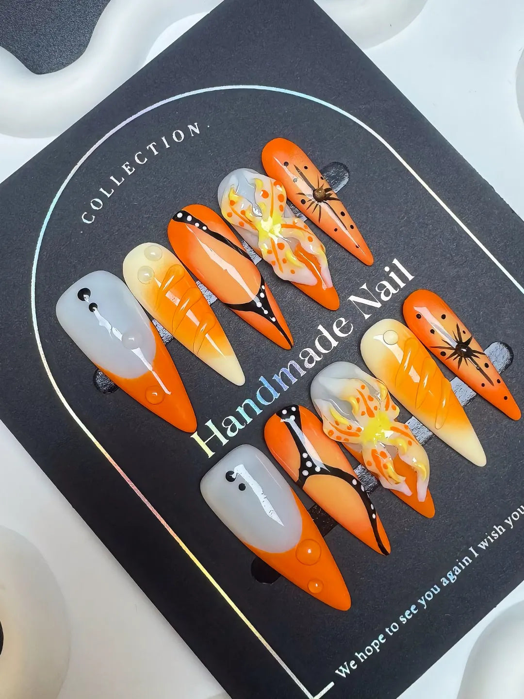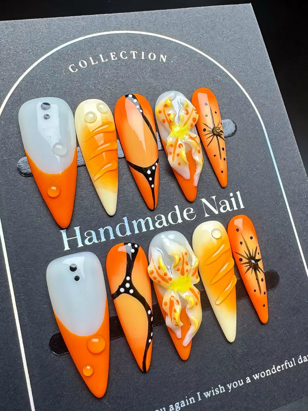 Long stiletto nails with orange French tips, ombré, 3D flames, leopard-inspired line art, and sculptural flowers or butterflies. Vibrant and detailed.
