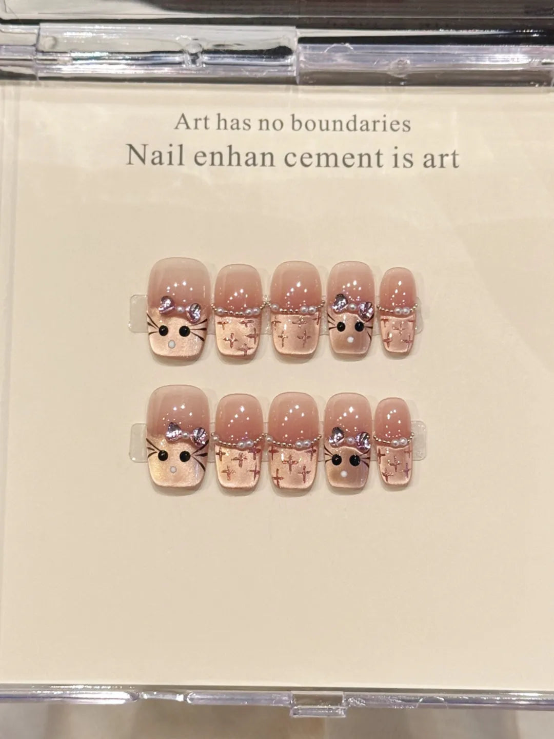 Handmade press on nails with peach gradient KT cat-eye and French hand-painted design, sweet, cute and flattering, perfect for daily wear or special looks.