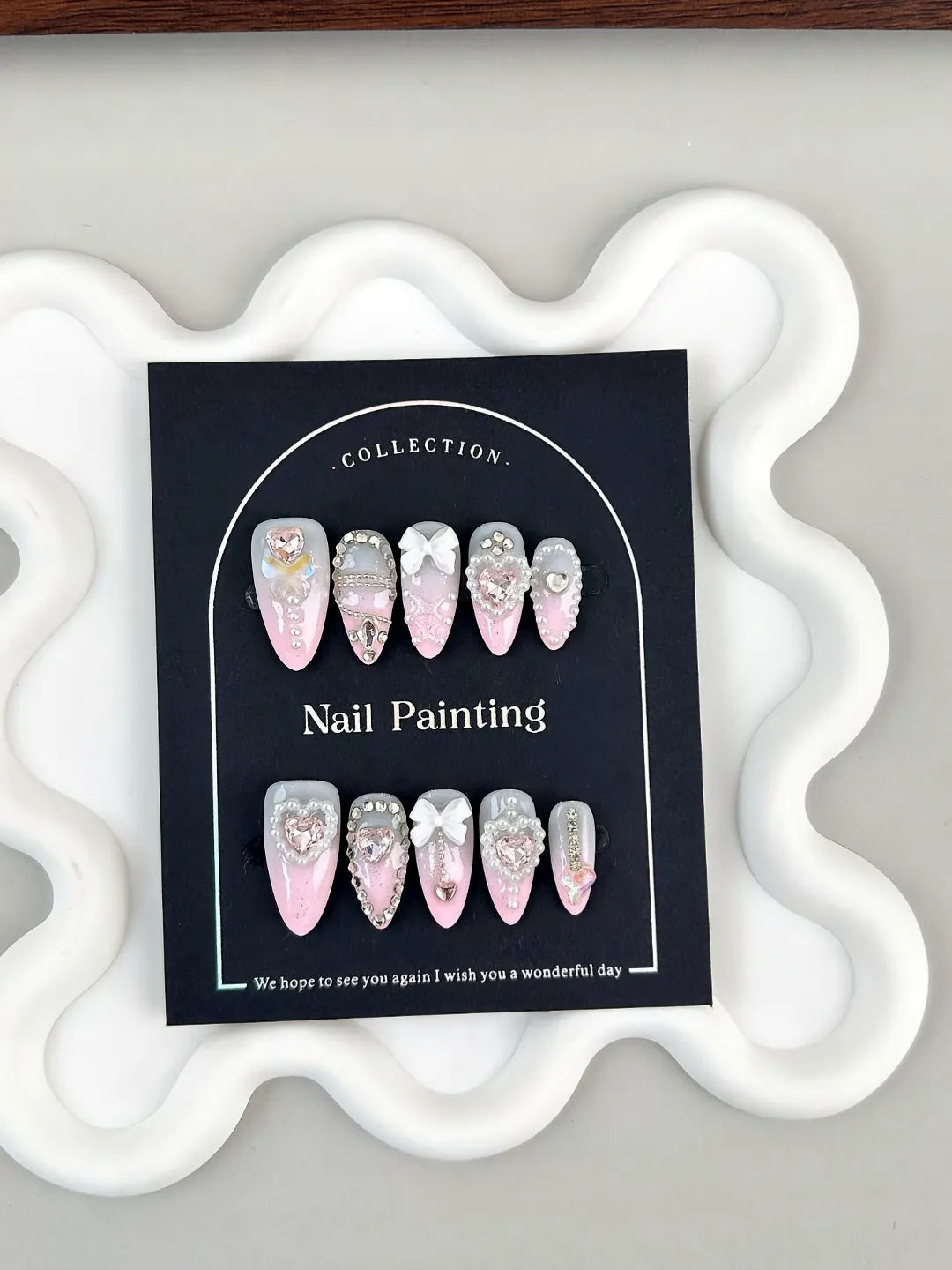 Medium almond nails with soft gray-blue & pink-lilac ombré, glitter accents, 3D gems, pearls, bows, and heart charms. Cute, romantic, and kawaii luxury.
