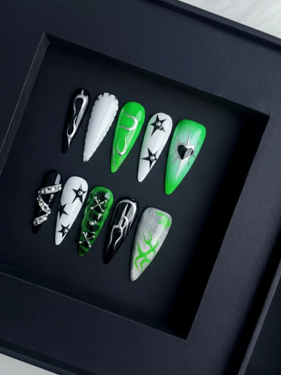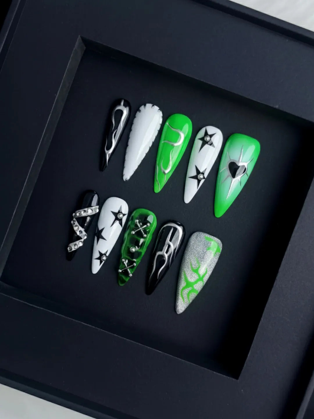 Green base with black and silver accents, featuring hand-painted hearts β sweet yet edgy, perfect for daily wear or parties.