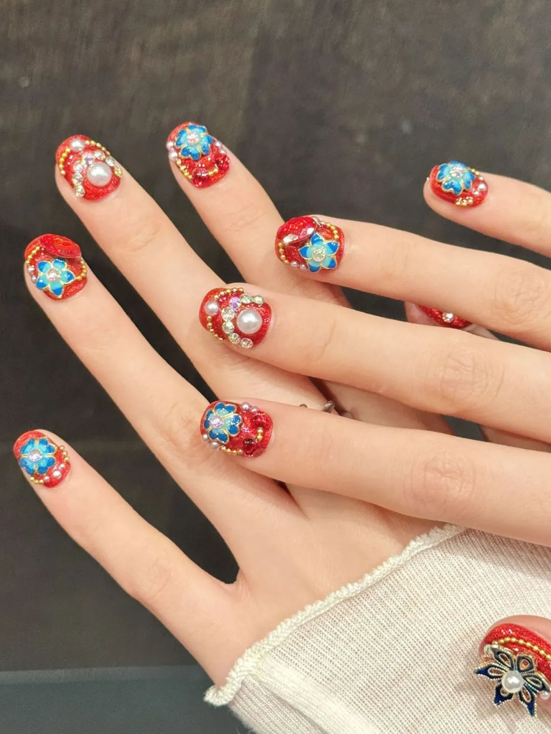 Red Blush Blue Tone 100% handmade nails with elegant red and blue harmony, perfect for daily wear, dates, or refined styling.