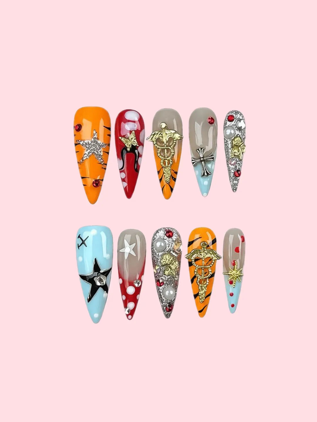 Handmade press-on nails with tiger stripes, polka dots, caduceus symbols, and chrome hearts. Bold, eccentric, and perfect for punk-inspired looks.