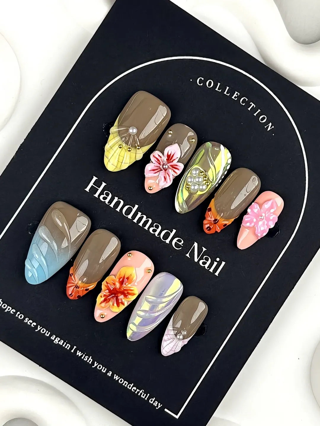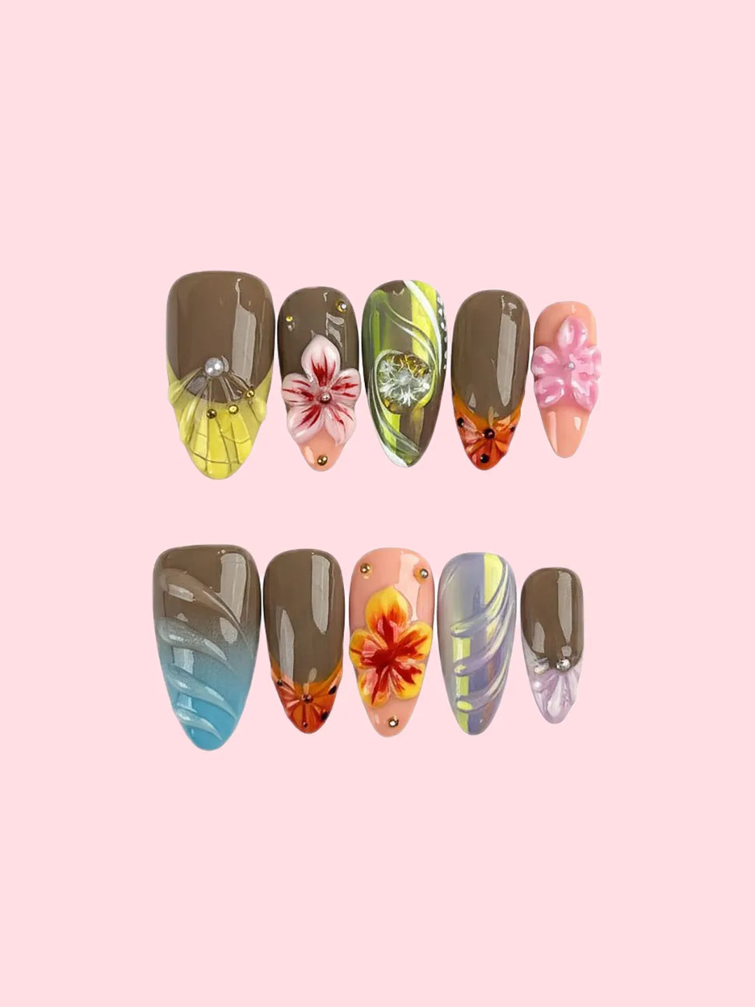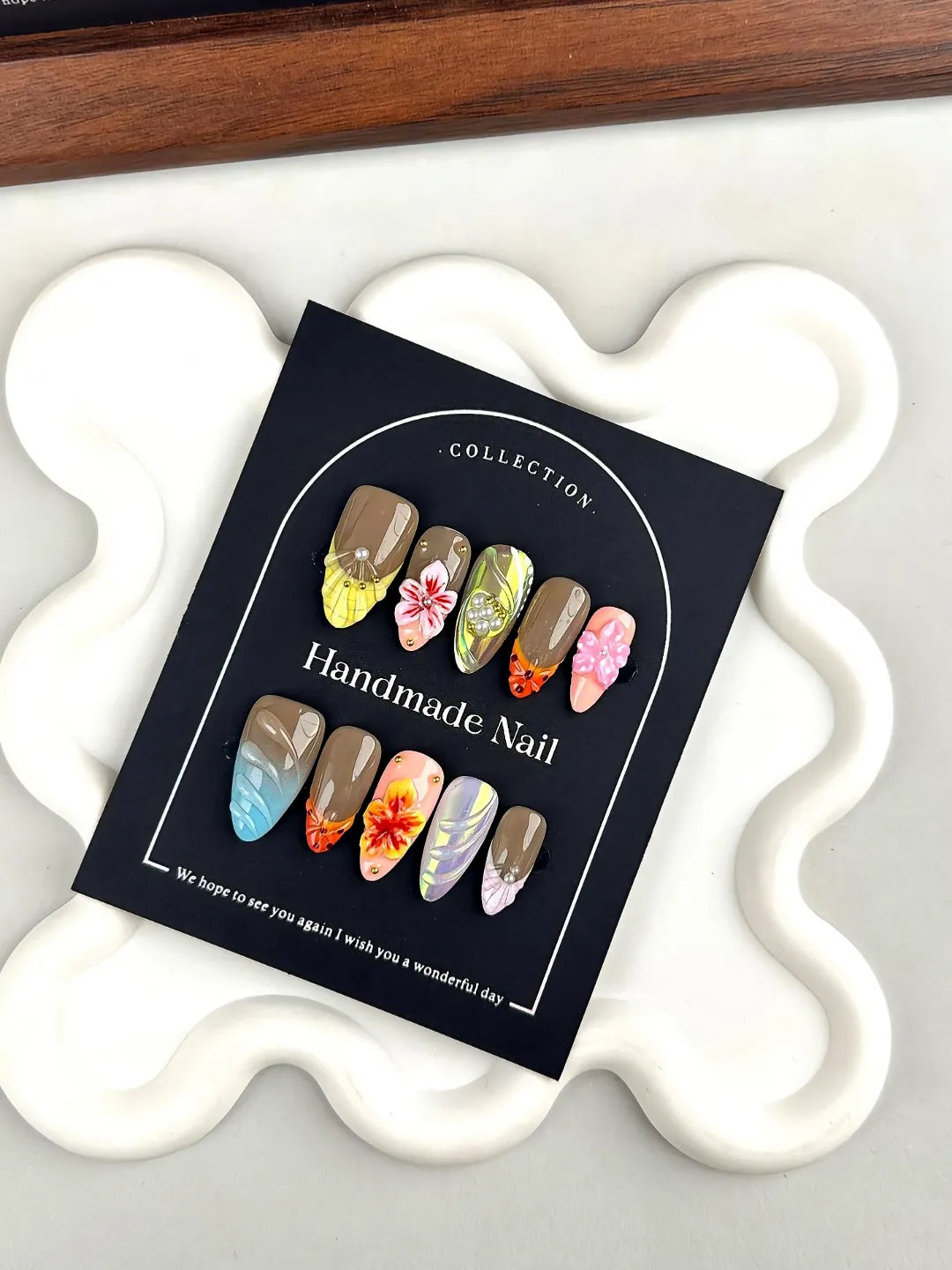 SAVANNAH SUNSET nails feature sunset gradient tones with handcrafted carvings, short and easy to wear, offering warm and elegant vibes, perfect for spring-summer everyday or party looks.