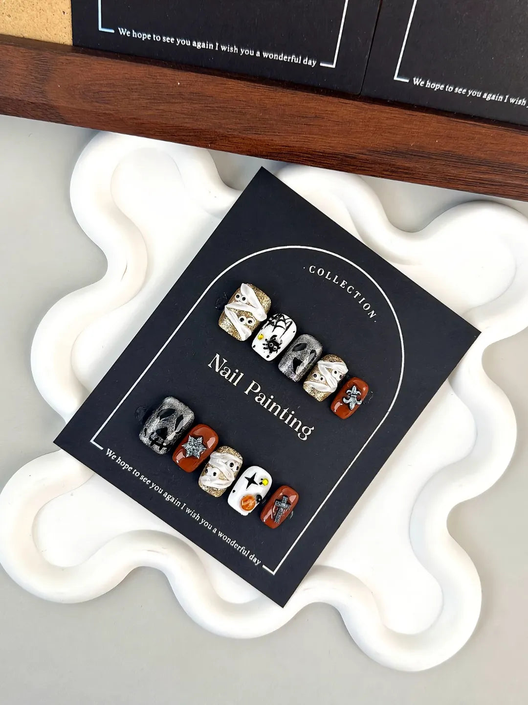 Short squoval nails with mummy wraps, spiderwebs, jack-o'-lanterns, skulls, and 3D charms. Cute, festive, and perfect for Halloween.
