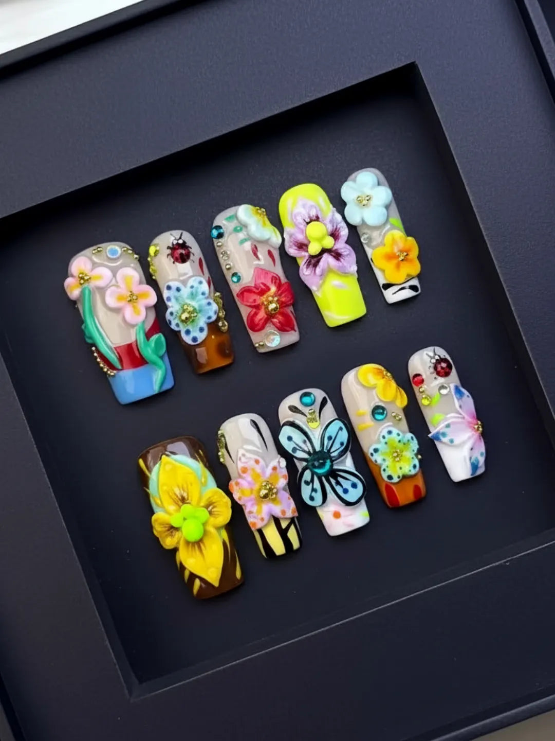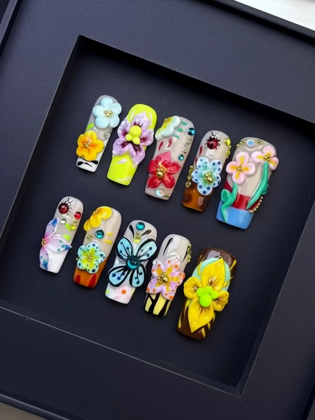 Light gradient base with delicate carved flowers and subtle shimmer β fresh and romantic, perfect for daily wear or dates.