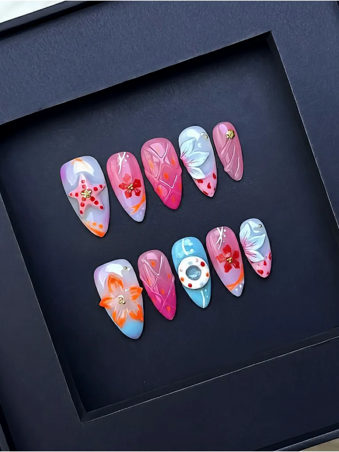STARFISH SPLASH nails feature handcrafted carvings with seashell accents on short nails, fresh and natural, easy to wear, perfect for spring-summer and beach looks.