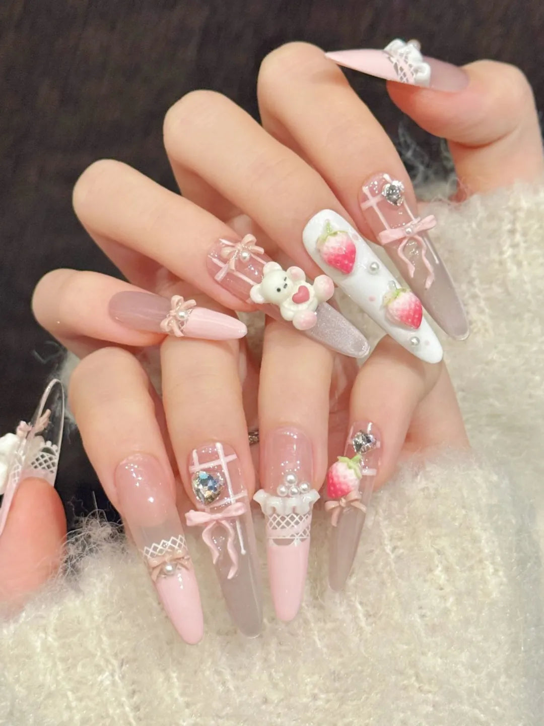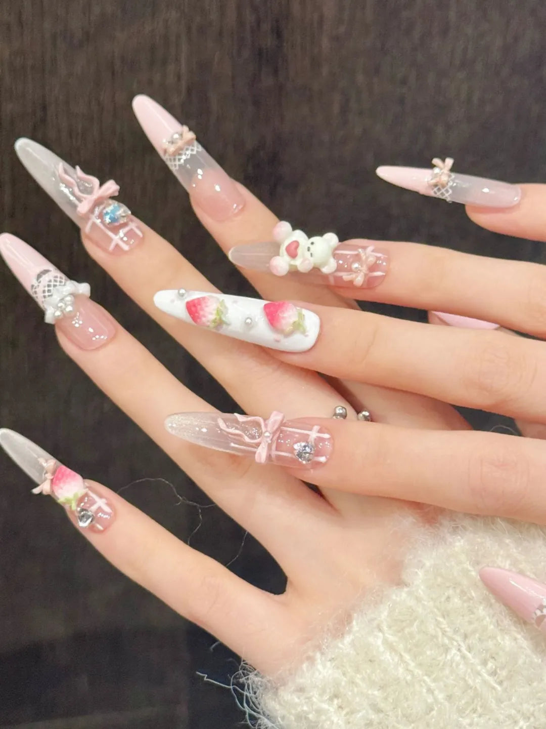 Style:Cute 3D nails featuring strawberry elements and bear designs, sweet, playful, and girly.