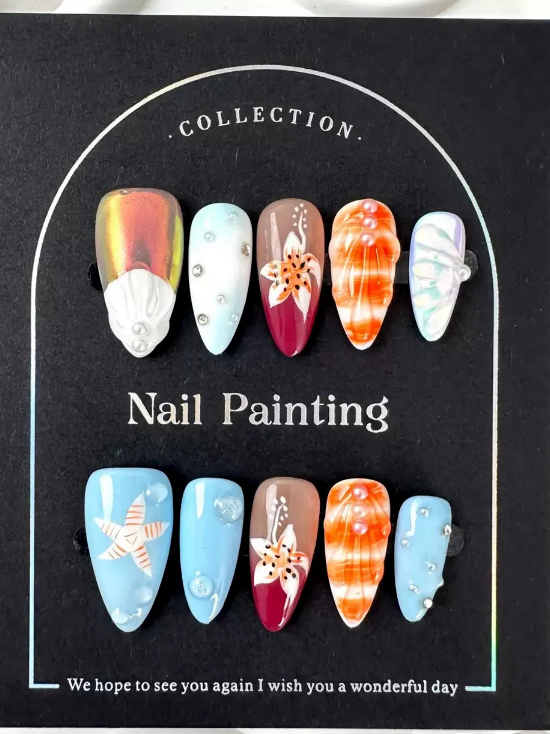 Gradient orange or peach base with hand-painted shells and subtle shimmer β warm and romantic like a sunset, perfect for summer beach or daily wear.