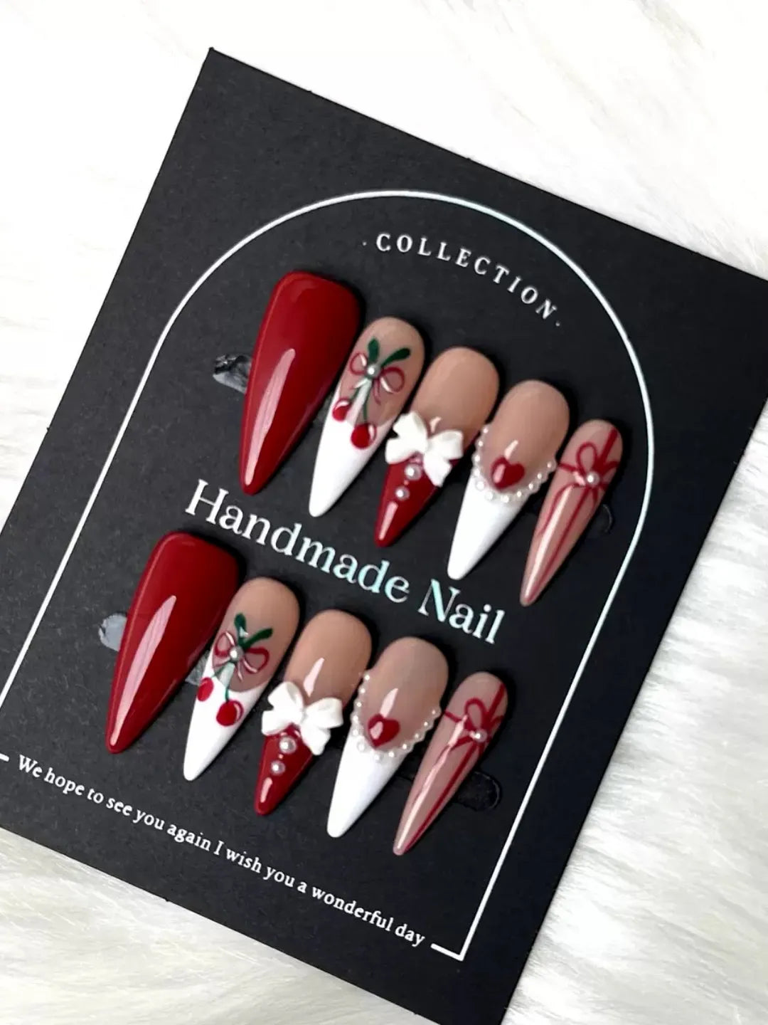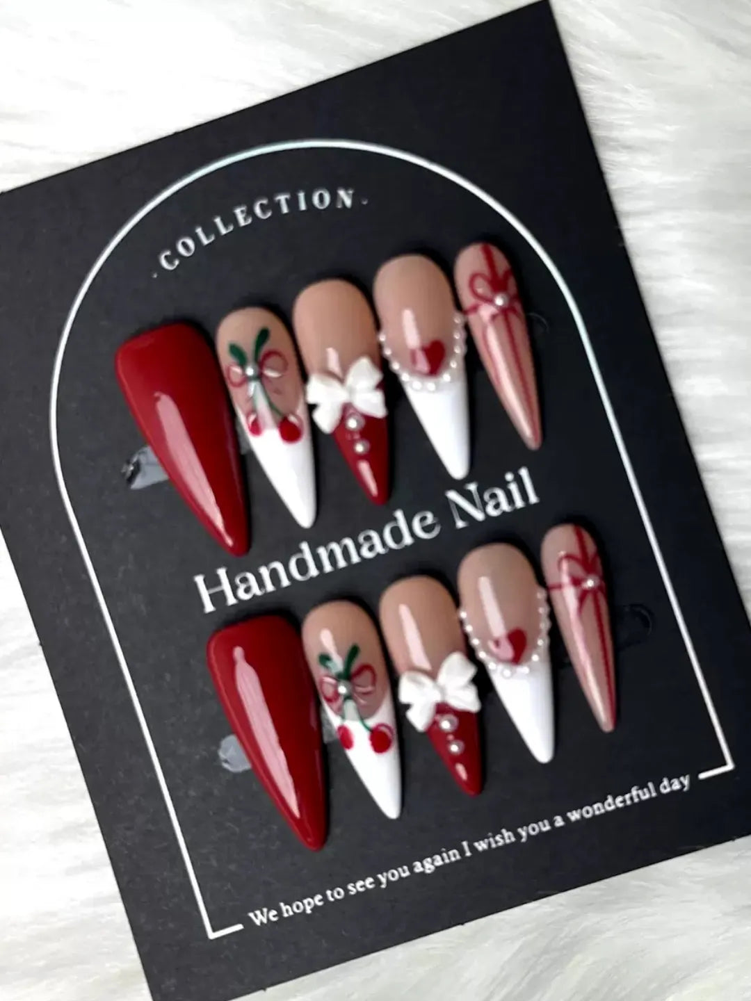 Nude base with hand-painted red cherries and subtle shimmer β sweet, fresh, and elegantly girly, perfect for daily wear or dates.