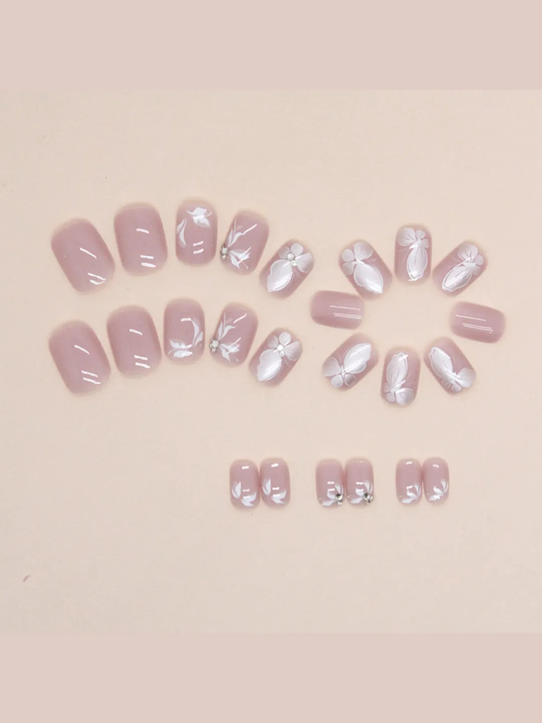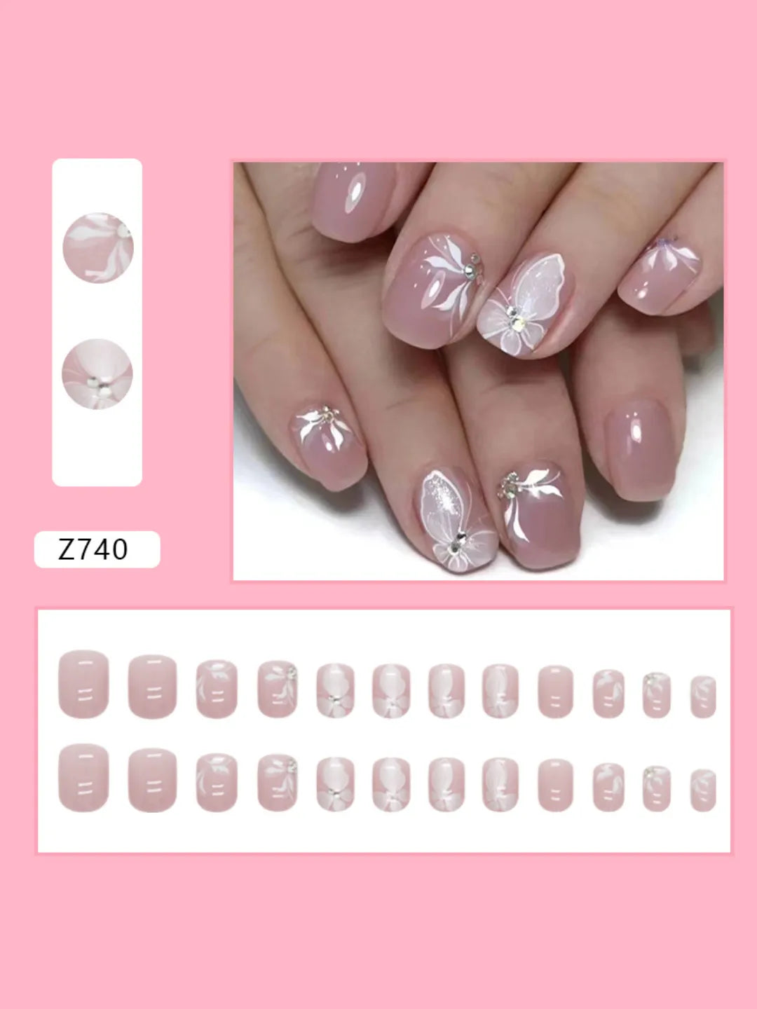- 24 press-on nails / 24 adhesive pads / 1 nail file / 1 cuticle pusher